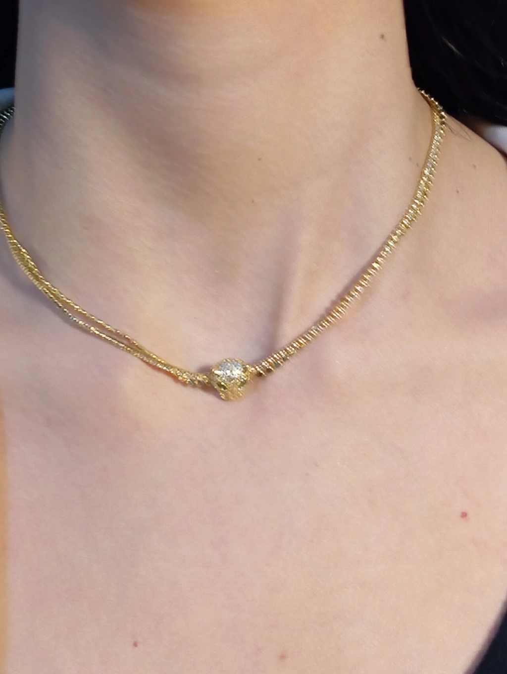 Gömleklerin içinde, V yaka bluzlarda veya straplez elbiselerde kusursuz duran bu ayarlanabilir kolye, kendinden emin stilinizin imzası olacak. Kararmaya karşı dirençlidir, nikel içermez ve antialerjiktir.