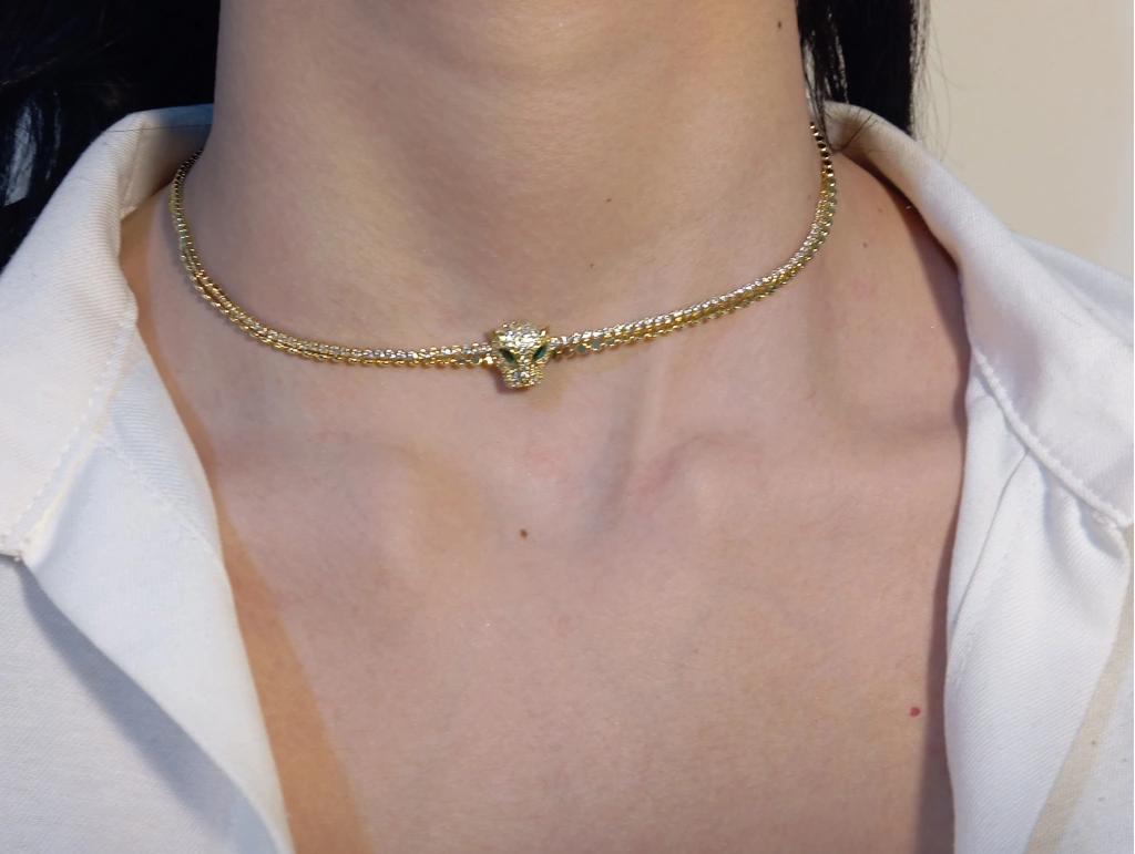 Bu özel ölçü (38-43 cm),kolyenin boynunuzu gerdanlık (choker) formunda sarmasına veya köprücük kemiği hizasında zarifçe durmasına olanak tanır. Panter figürü aşağıya sarkmaz, teninizle bütünleşir ve her an göz önünde kalır.
