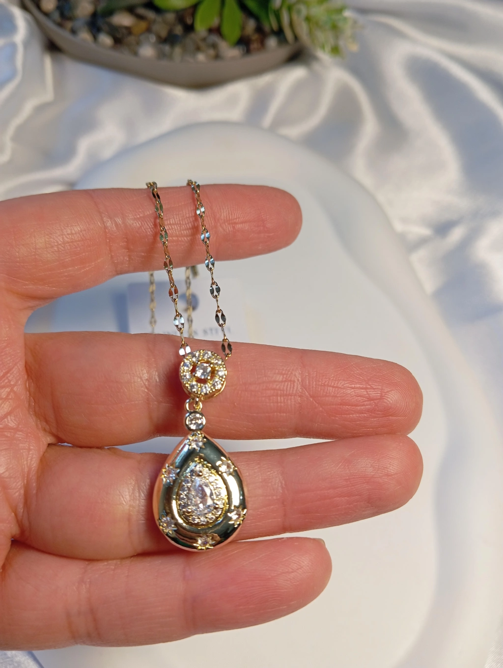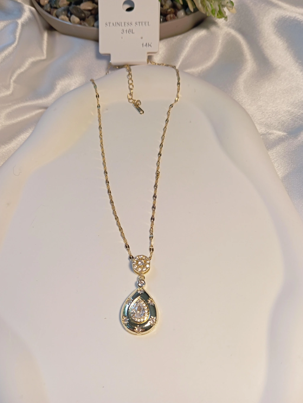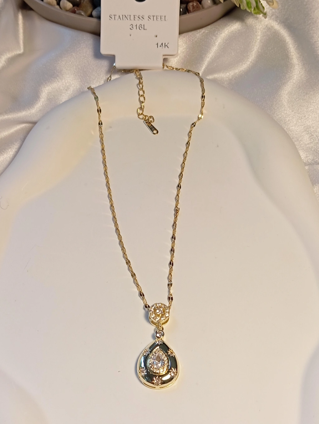 Minimalist ve zamansız bir görünüme sahip ince zincir ve gözyaşı damlasını andıran, ışığı yakalayan merkezi taş.
