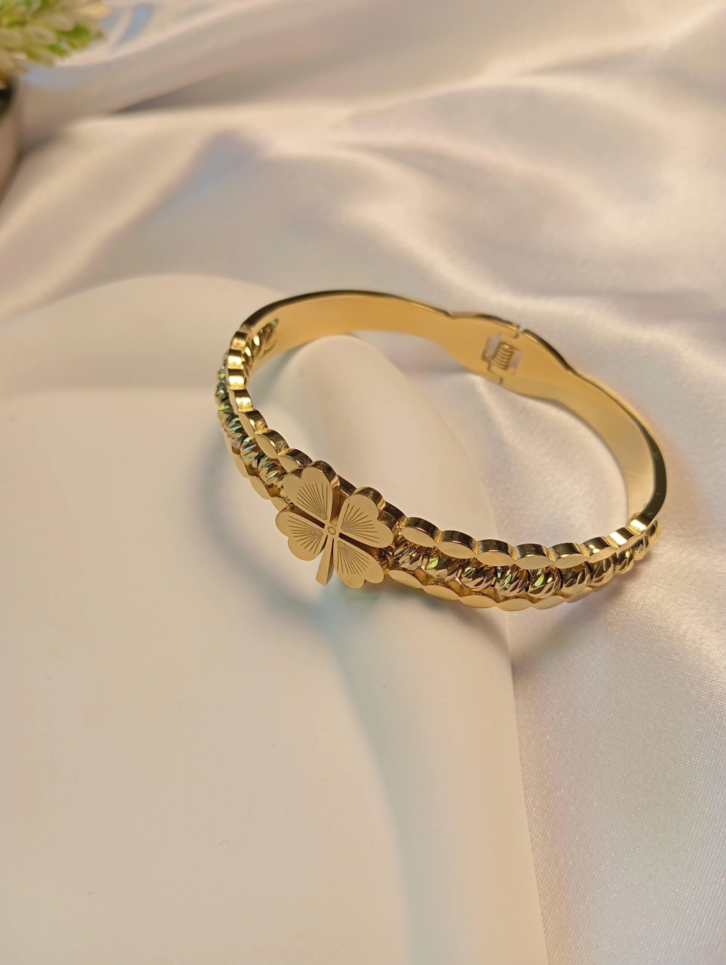 14K Yonca Detaylı Dorikalı Çelik Kelepçe Bileklik: Şans ve Zarafet Bileğinizde!
