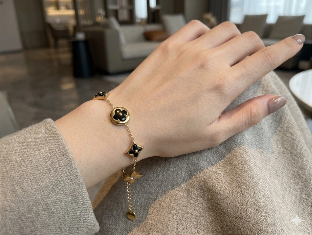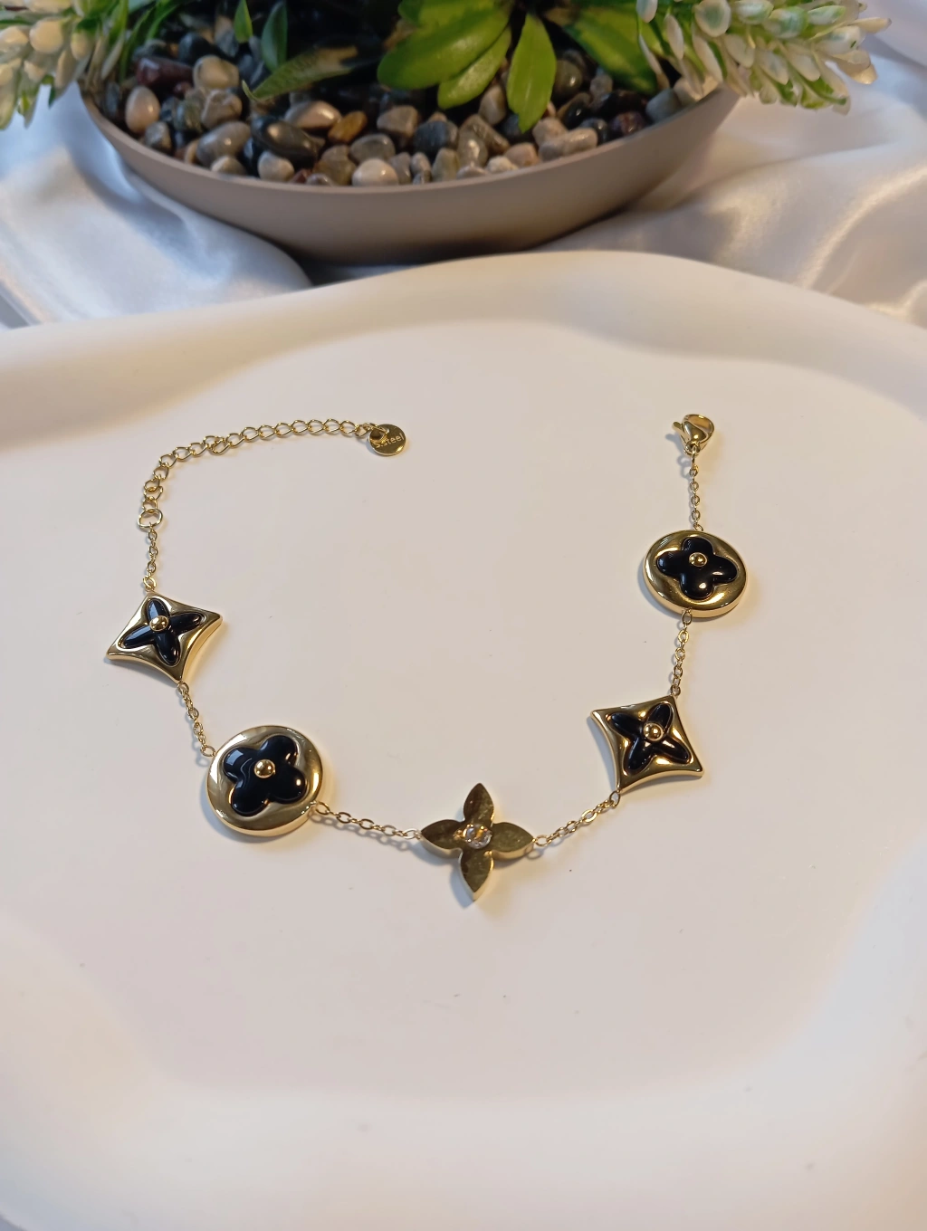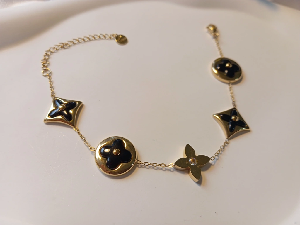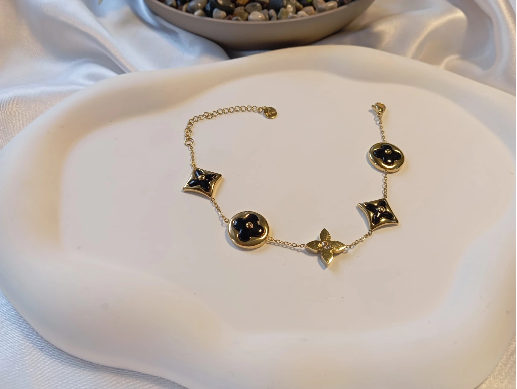 Bilekliğin tasarımı, gold rengi ve siyah emaye detaylarıyla dikkat çekiyor. Üzerinde yer alan geometrik ve dört yapraklı yonca motifleri, stilinize zarif bir dokunuş katıyor. Hem günlük kullanım hem de özel günler için ideal olan bu bileklik, sevdiklerinize hediye etmek için de harika bir seçenektir. Ayarlanabilir halkası sayesinde rahatça takıp çıkarabilirsiniz.