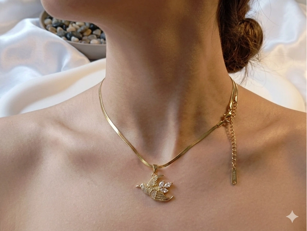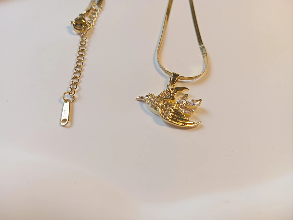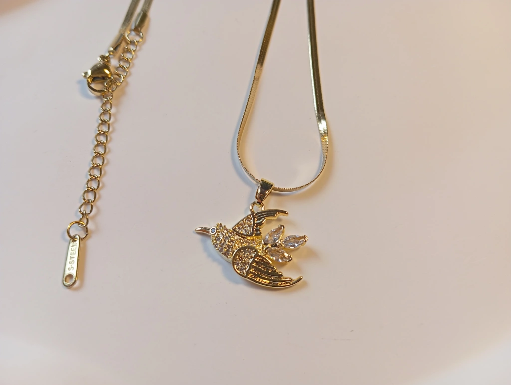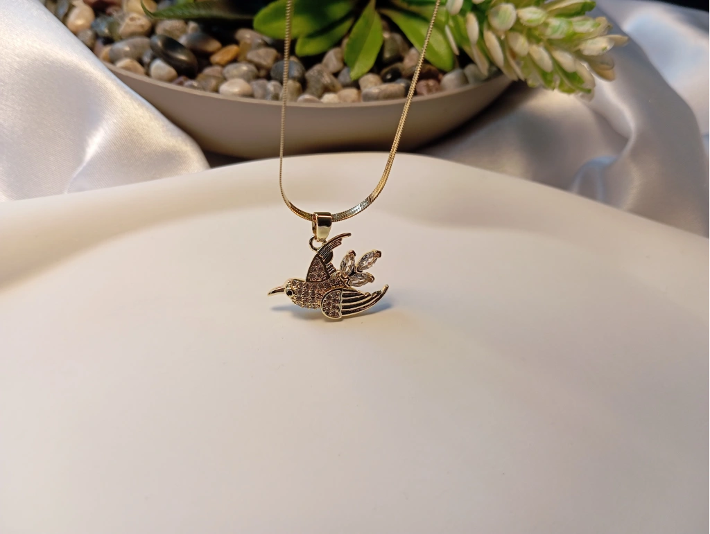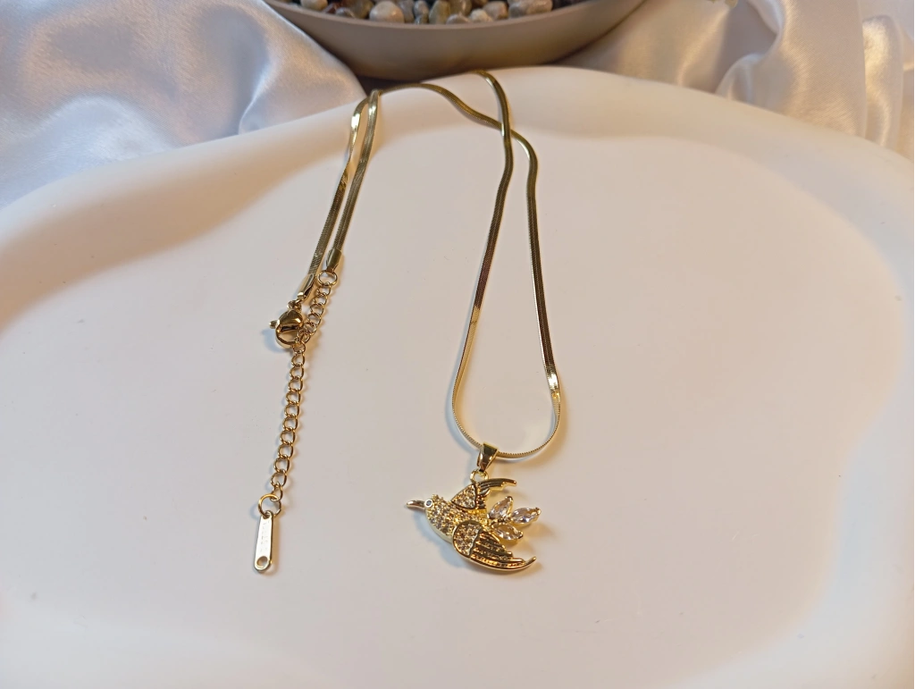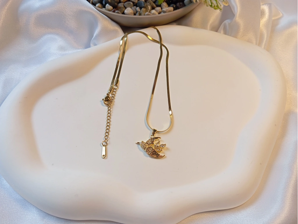 Kolyenin gold balık sırtı zinciri, şık ve modern bir görünüm katarken, kuş figürlü ucu ışıltılı zirkon taşlarla bezenmiştir. Kuş figürü, özgürlüğü ve huzuru simgeler. Hem günlük kullanım hem de özel günler için ideal olan bu kolye, sevdiklerinize hediye etmek için de harika bir seçenektir. Ayarlanabilir halkası sayesinde rahatça takıp çıkarabilirsiniz.
