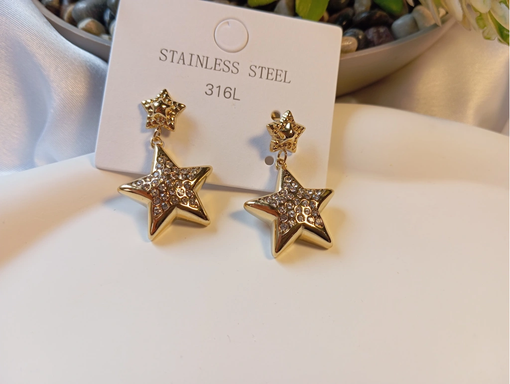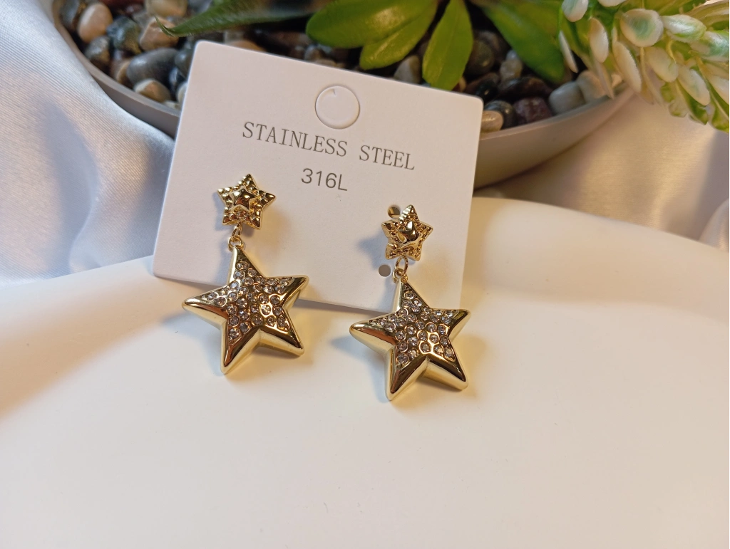 Zarafeti ve gökyüzünün ışıltısını kulaklarınıza taşıyan bu özel tasarım, 316L cerrahi sınıf paslanmaz çelikten üretilmiştir. Antialerjik yapısı sayesinde hassas ciltler için idealdir. Üst kısımda küçük bir yıldız motifi ve alt kısımda sallanan, içi mikro zirkon taşlarla döşenmiş büyük yıldız detayı ile hem günlük kombinlerinize hem de özel davetlerinize şıklık katar. Kararmaya karşı yüksek dirençli gold kaplaması ile uzun ömürlü kullanım sunar.