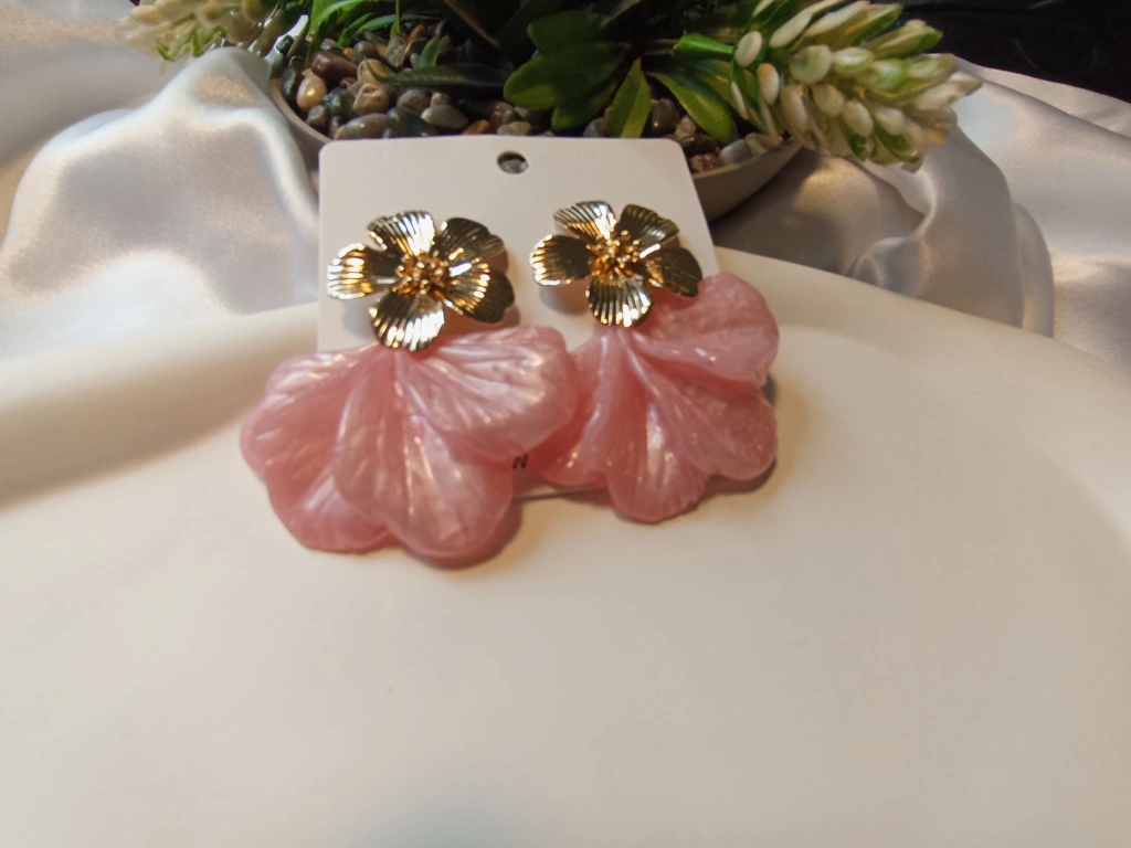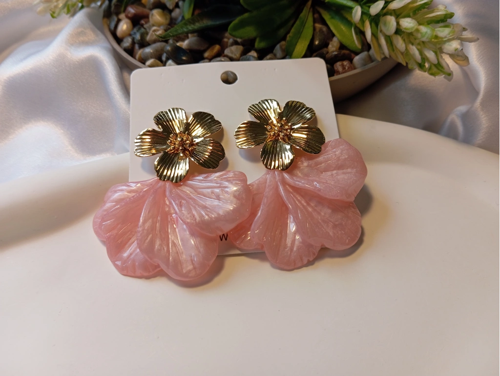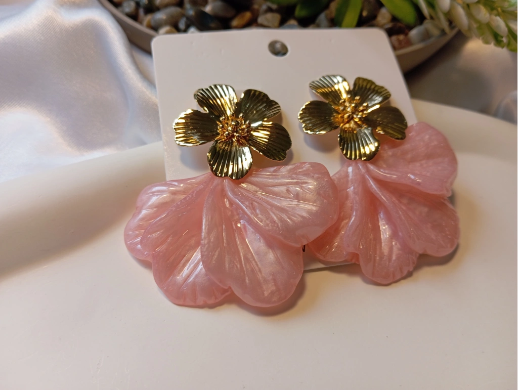 Altın Kaplama Çiçek Detaylı Toz Pembe Akrilik Petal Küpe (5,5 cm)