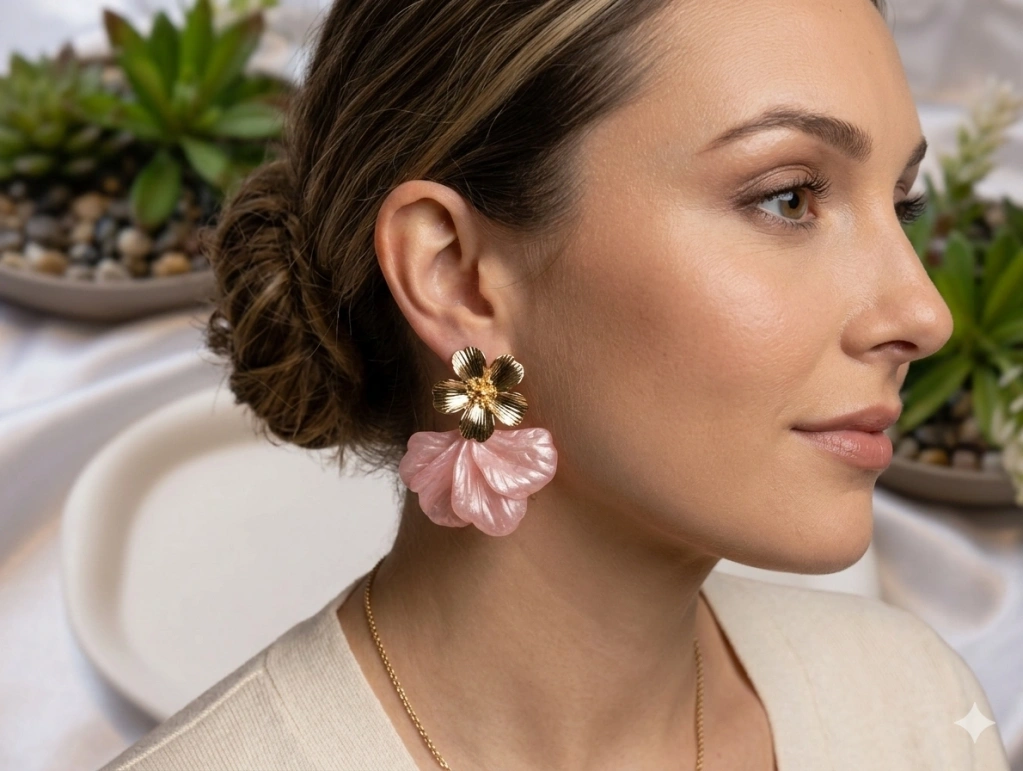 Stilinize romantik bir bahar dokunuşu ekleyin. Bu çarpıcı bijuteri küpe, üst kısımdaki altın rengi metalik çiçek figürü ile alt kısımdaki sedefli dokuya sahip toz pembe akrilik yaprakların büyüleyici uyumunu sunar. İddialı boyutuyla "statement" takı kategorisinin en zarif örneklerinden biri olan bu model, hem günlük şıklığınızda hem de özel davetlerinizde tüm bakışları üzerinize çekecek.