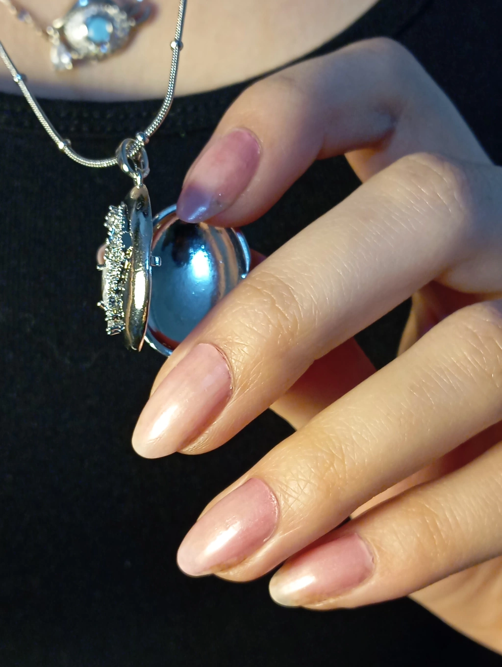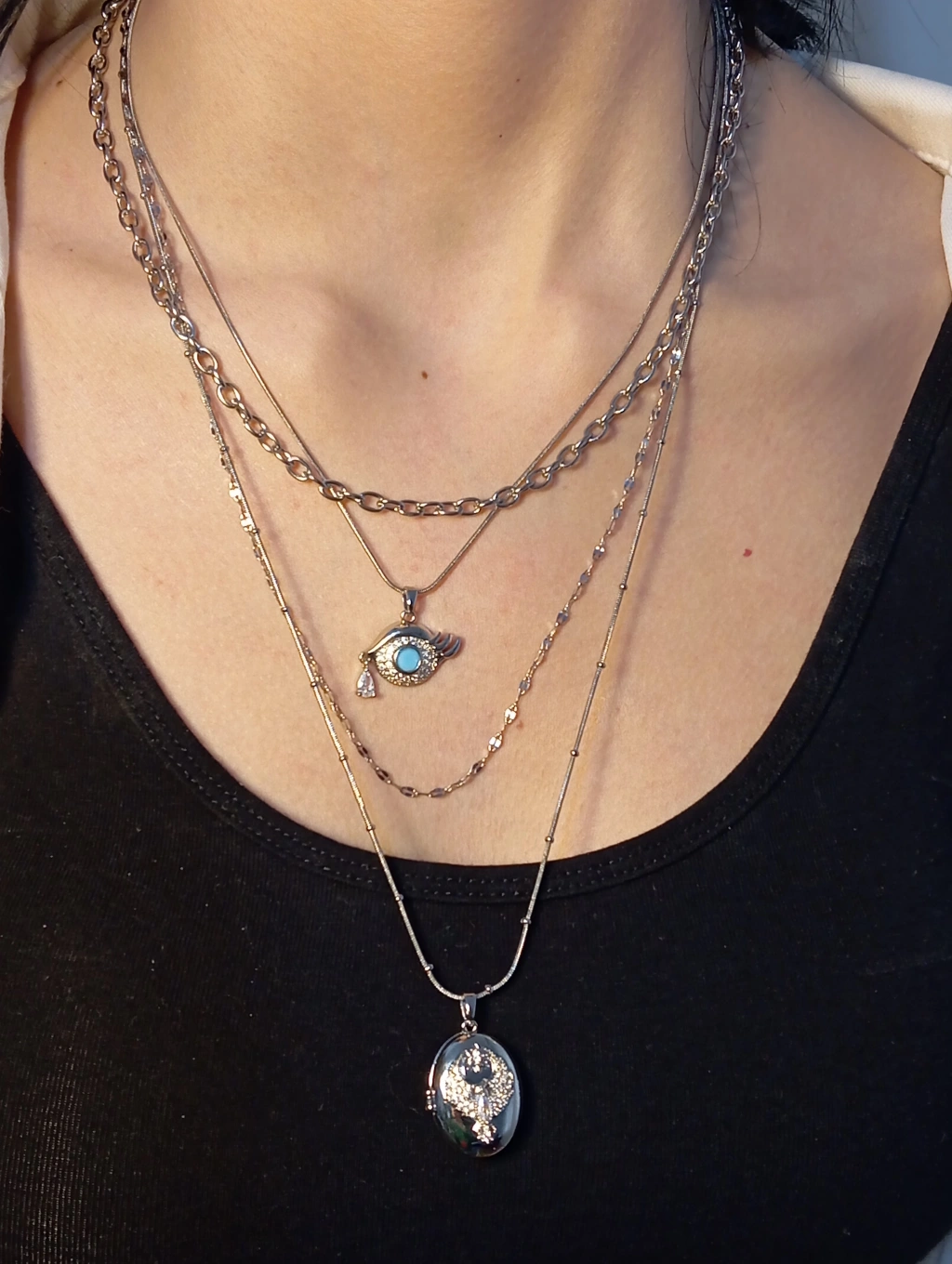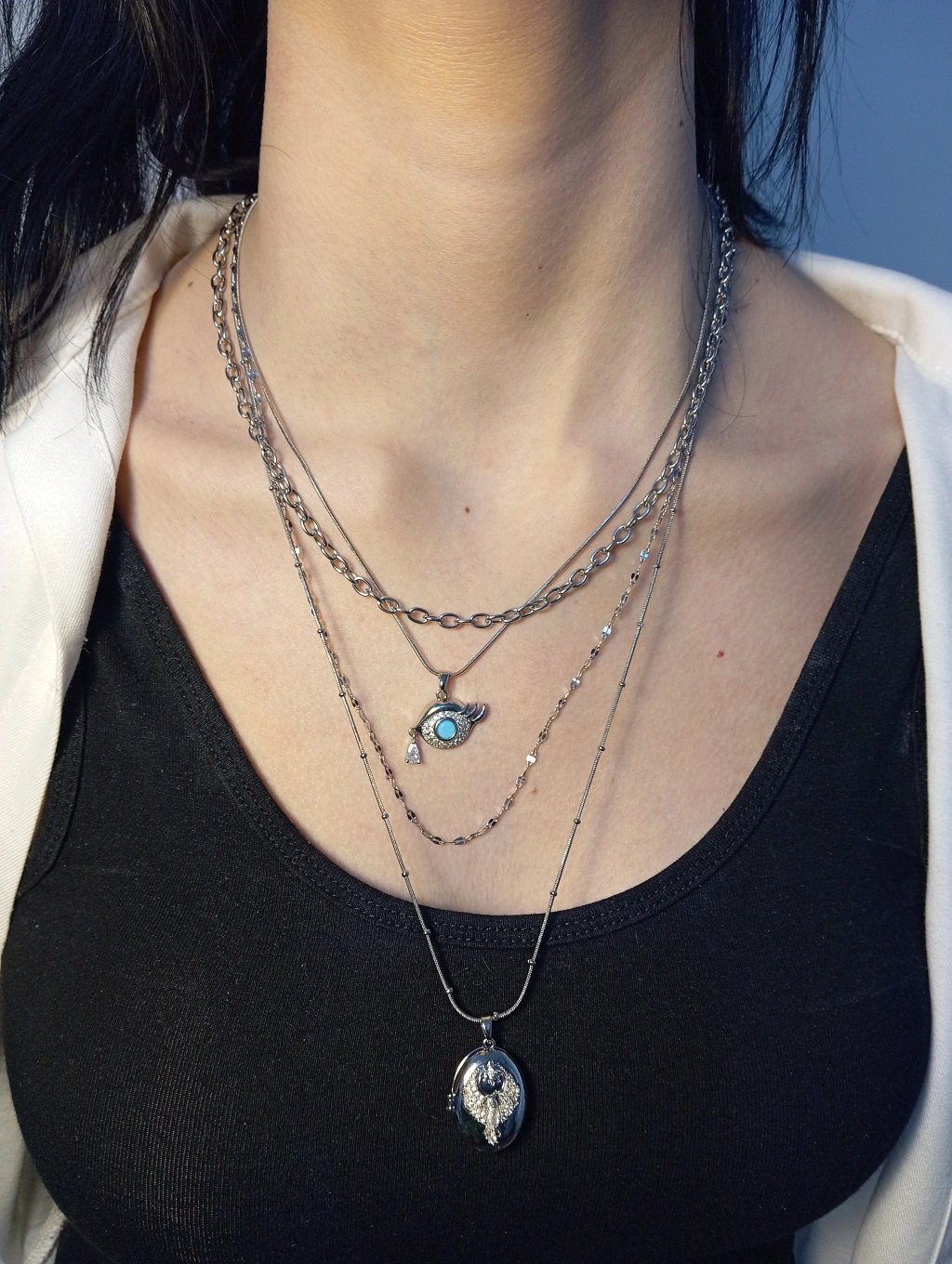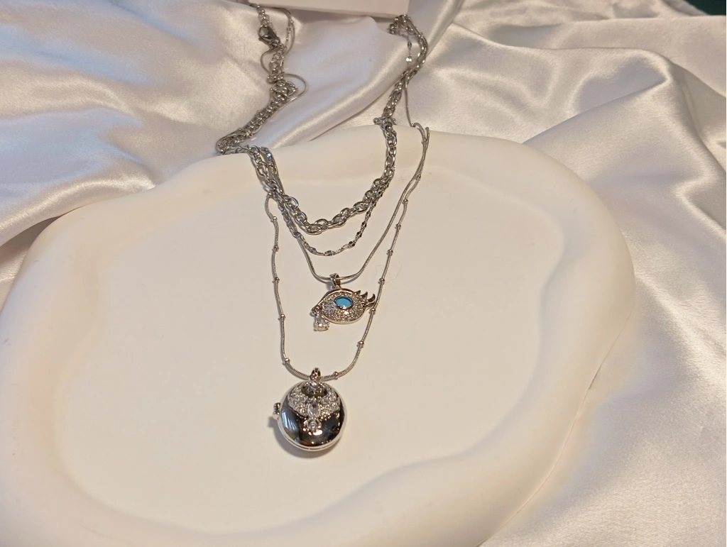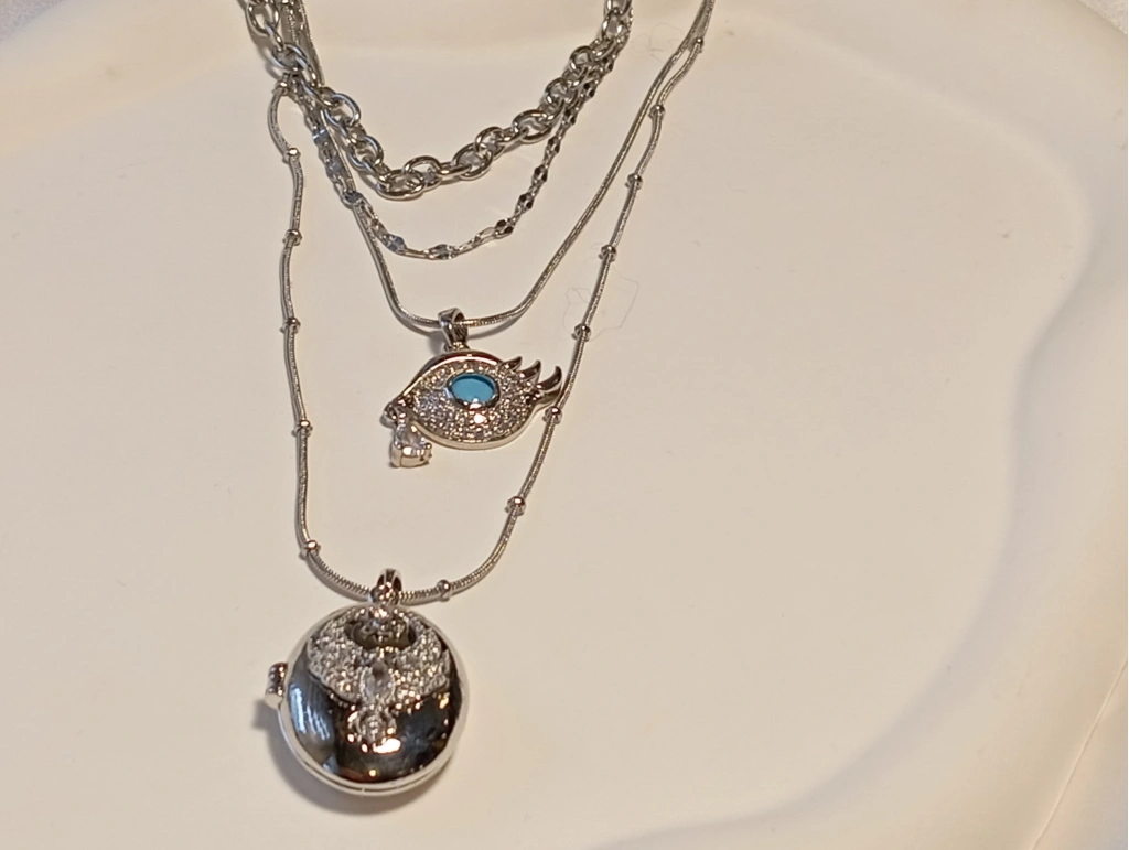 Mistik Işıltı ve Modern Tasarım: Çelik Katmanlı Göz ve Oval Madalyon Kolye - Gümüş Renk