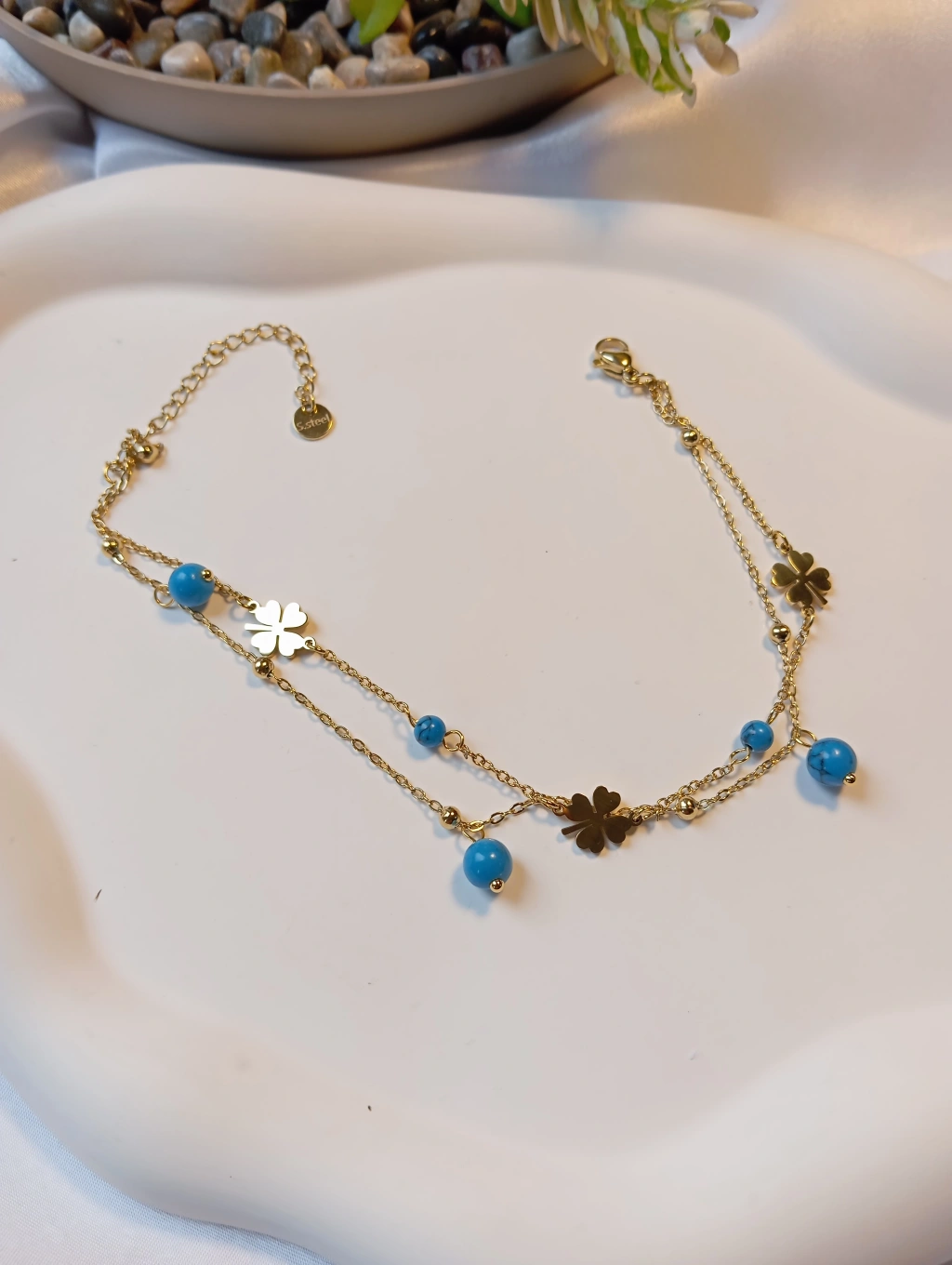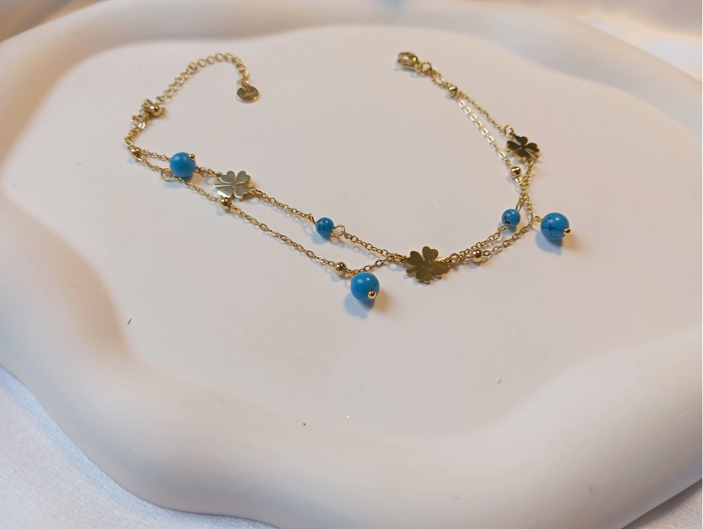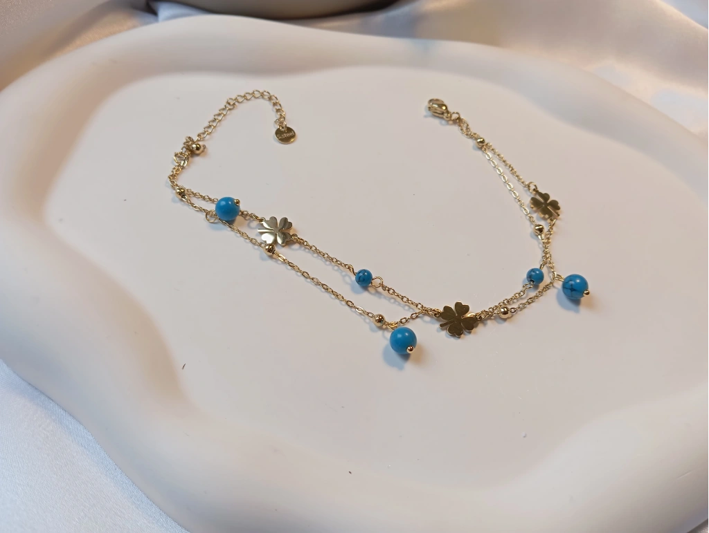 Zarif Tasarım: Şansın sembolü dört yapraklı yoncalar ve canlı firuze rengi doğal taş görünümlü boncuklarla bezeli çift katlı zincir tasarımı.