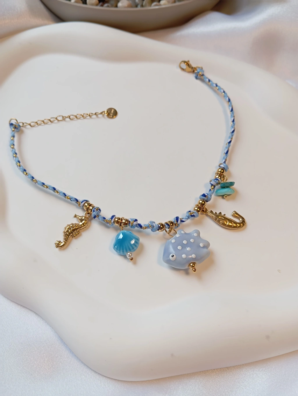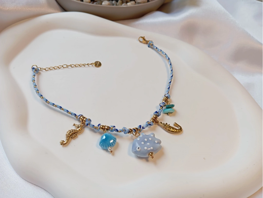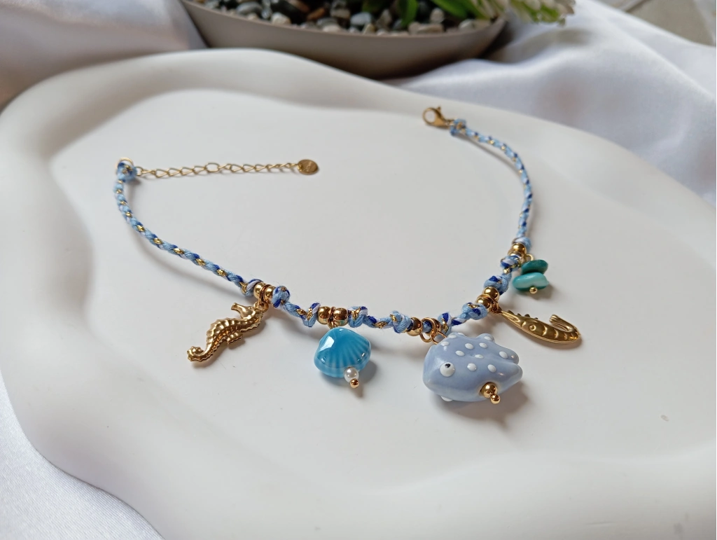 Tasarım: Denizatı ve deniz kabuğu figürleri ile mavi tonlarında zarif boncuk detayları.