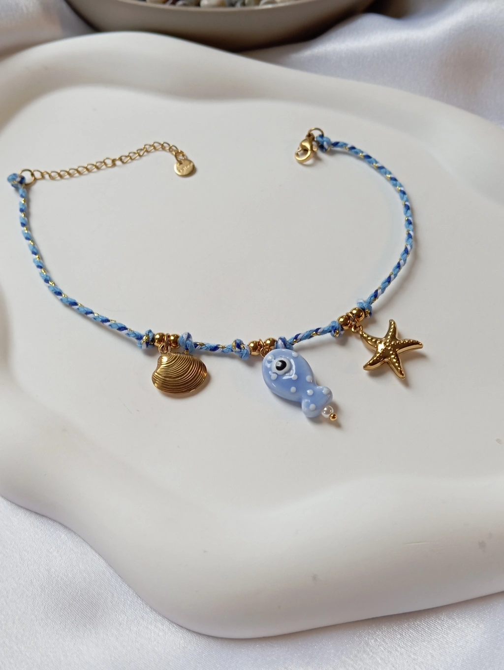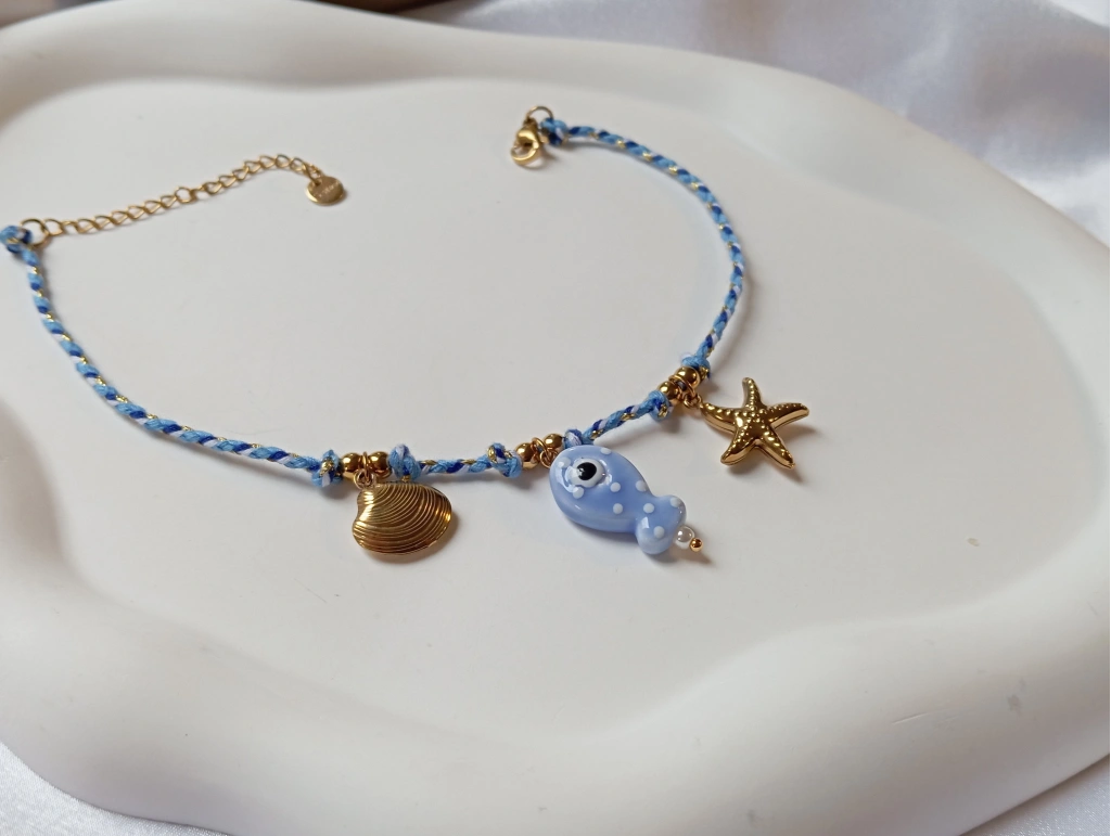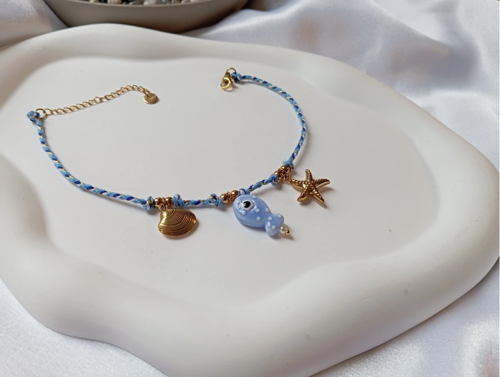 Özel Tasarım: Altın rengi deniz yıldızı, istiridye kabuğu ve sevimli mavi benekli balık figürü ile hareketlendirilmiş örgü kordon detaylı tasarım.