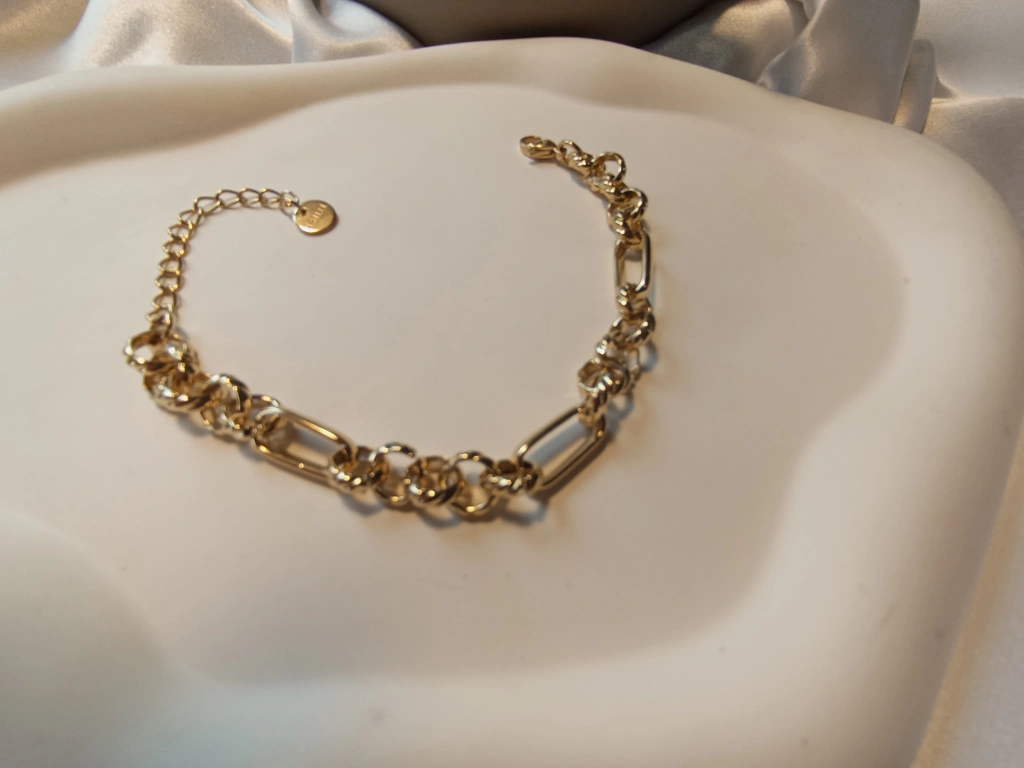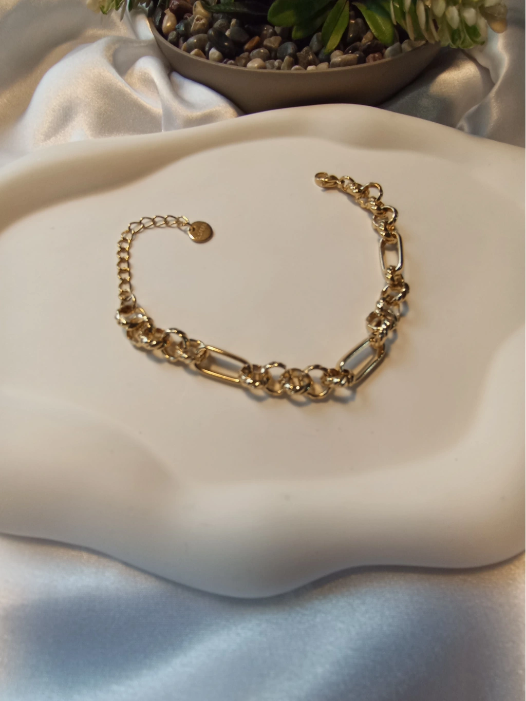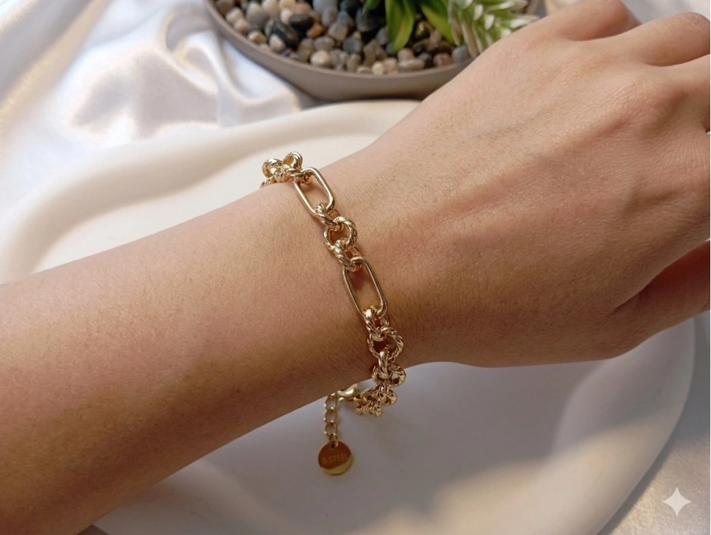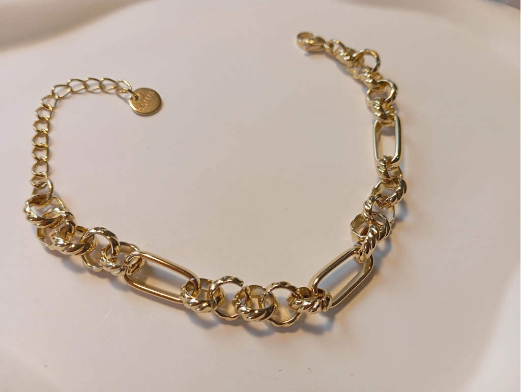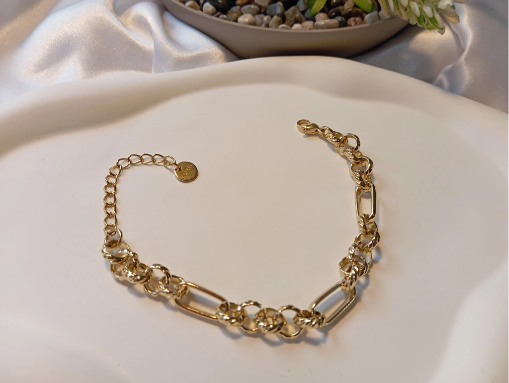 arafeti ve dayanıklılığı bir araya getiren bu özel tasarım bileklik, stilinizi bir üst seviyeye taşıyacak. Yüksek kaliteli 316L cerrahi çelikten üretilen bileklik, gerçek 14 ayar altın kaplama ile göz alıcı bir parlaklığa sahiptir. Klasik Figaro zincir yapısının modern halka detaylarıyla harmanlandığı bu model, hem günlük kullanım hem de özel günler için mükemmel bir tercihtir. Antialerjik yapısı sayesinde hassas ciltler için uygundur ve kararmaya karşı dirençlidir. 17 cm ana uzunluğa ek olarak 6 cm uzatma zinciri ile 17-23 cm arası ayarlanabilir, her bileğe uyum sağlar.
