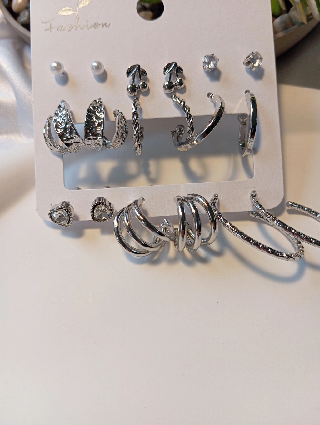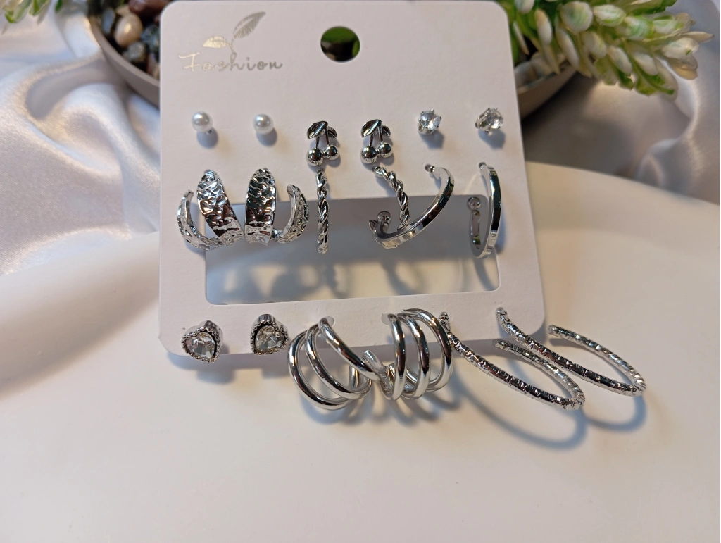Euro Aksesuar 6 Çift Gümüş Renk Pirinç Çoklu Küpe Seti - Karışık Model Halkave Vidalı Piercing Uyumlu Set