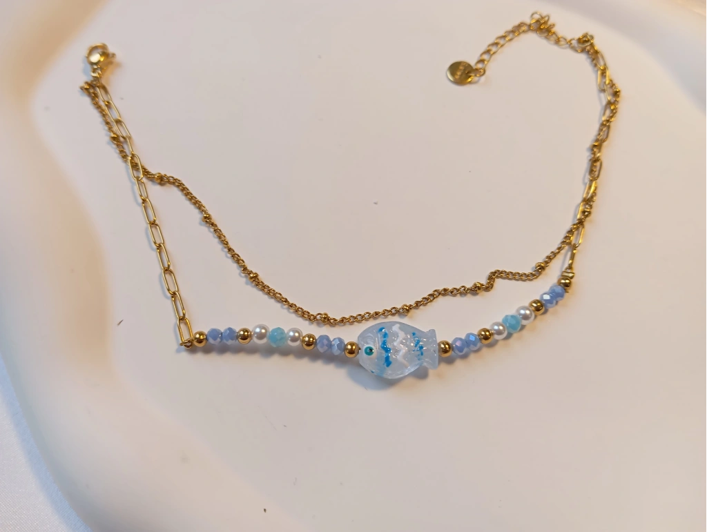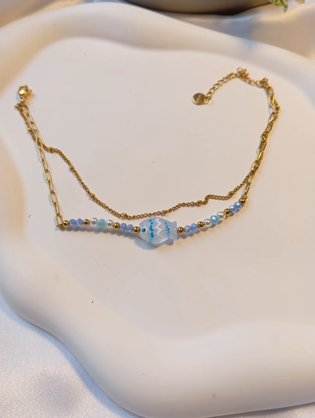 Tasarım: Bir yanda zarif ince zincir, diğer yanda ise şık bir ataç zincir ve ortasında kristal boncuklarla bezeli, şeffaf mavi cam balık figürü yer almaktadır.