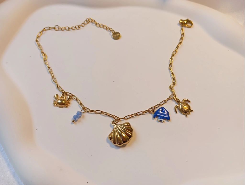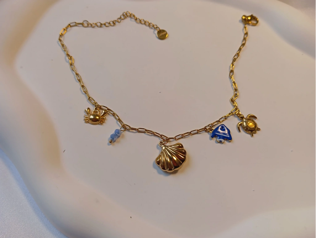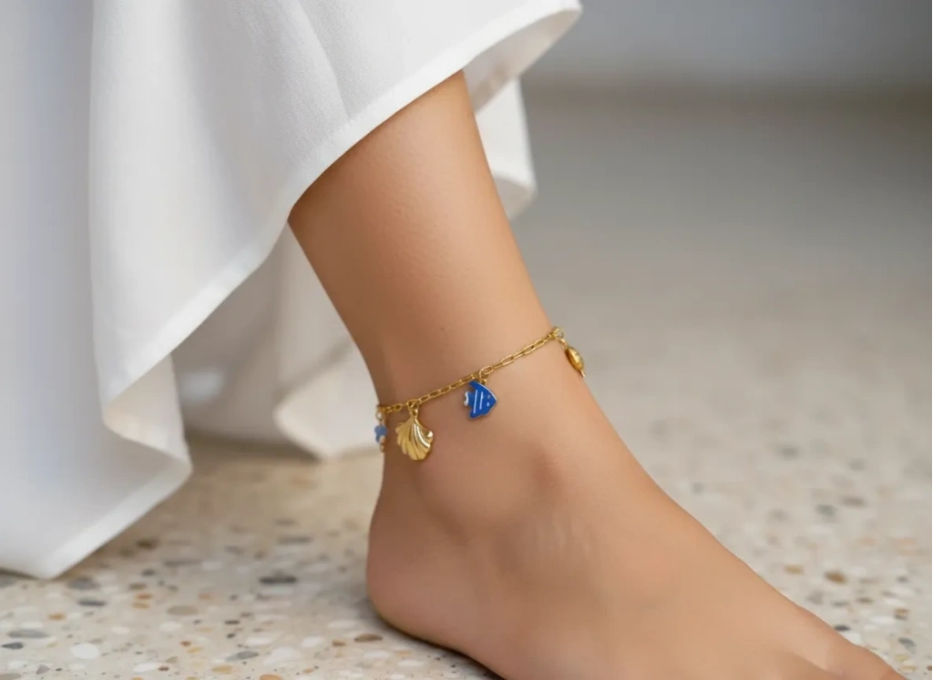 Tasarım: Halhal üzerinde altın rengi yengeç, deniz kabuğu ve kaplumbağa figürlerine; mavi mineli balık ve kristal boncuk detayları eşlik eder.
