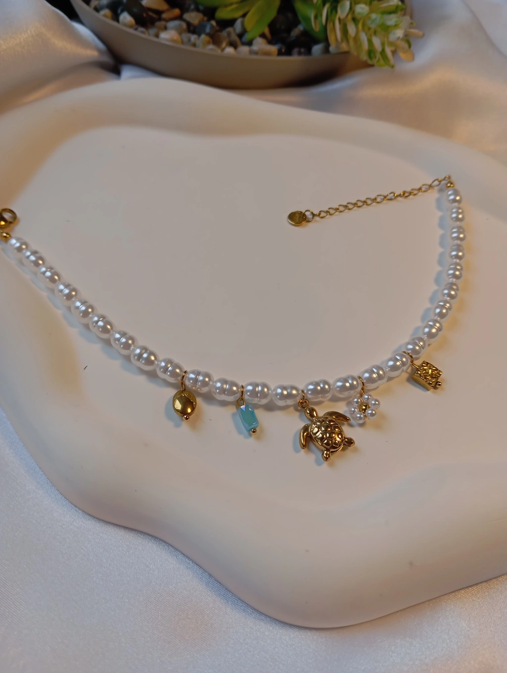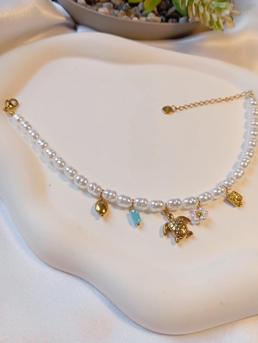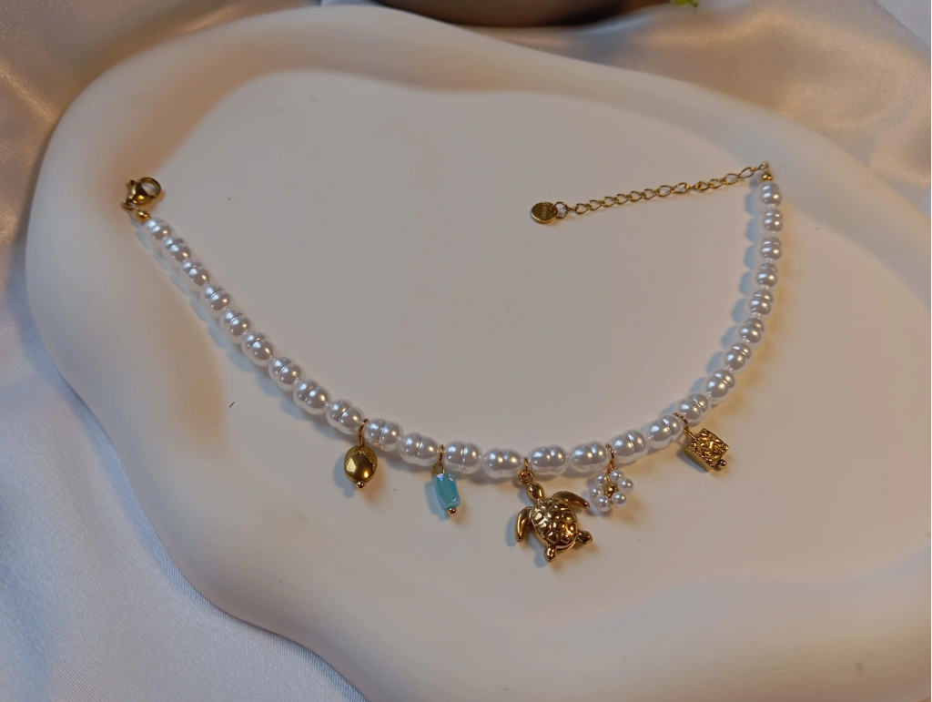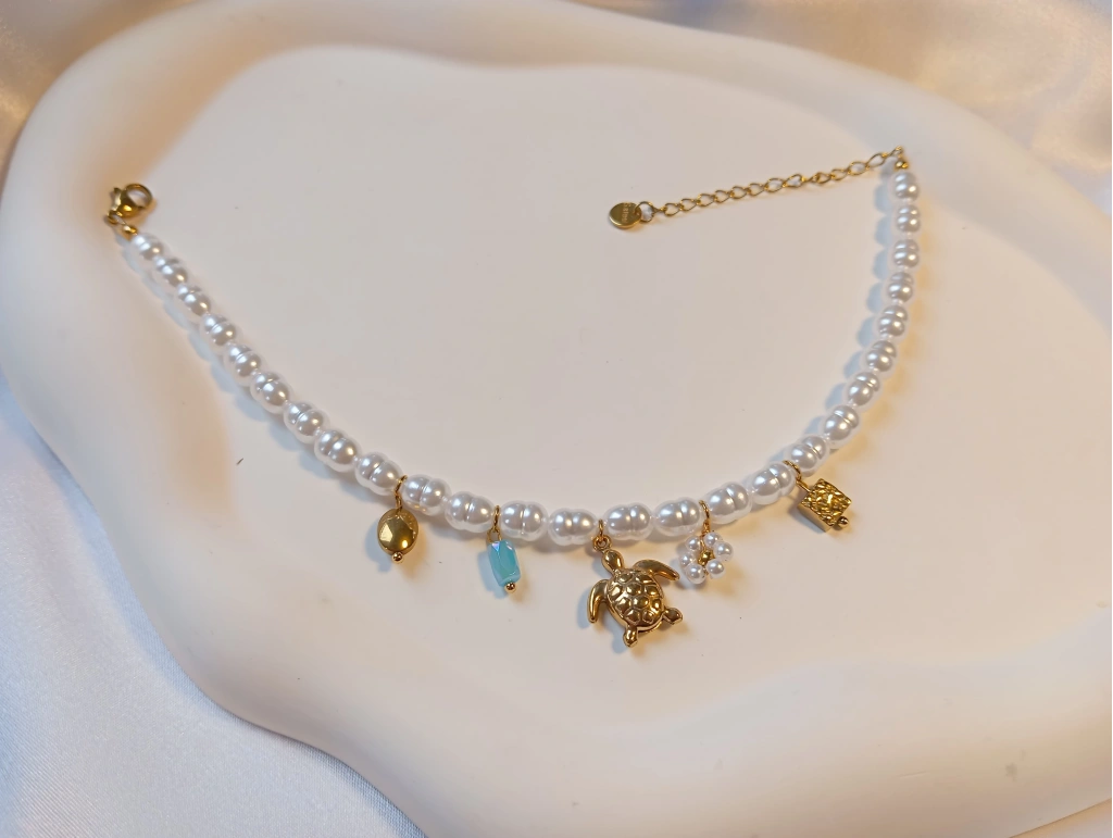 Tasarım Detayları: Model seçeneklerine göre; yüksek kalite incilerle dizili deniz yıldızı, balık kuyruğu ve kaplumbağa figürleri veya modern top zincir üzerine dizili parlak kalpler ve zirkon taşlar yer almaktadır.