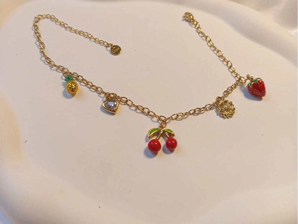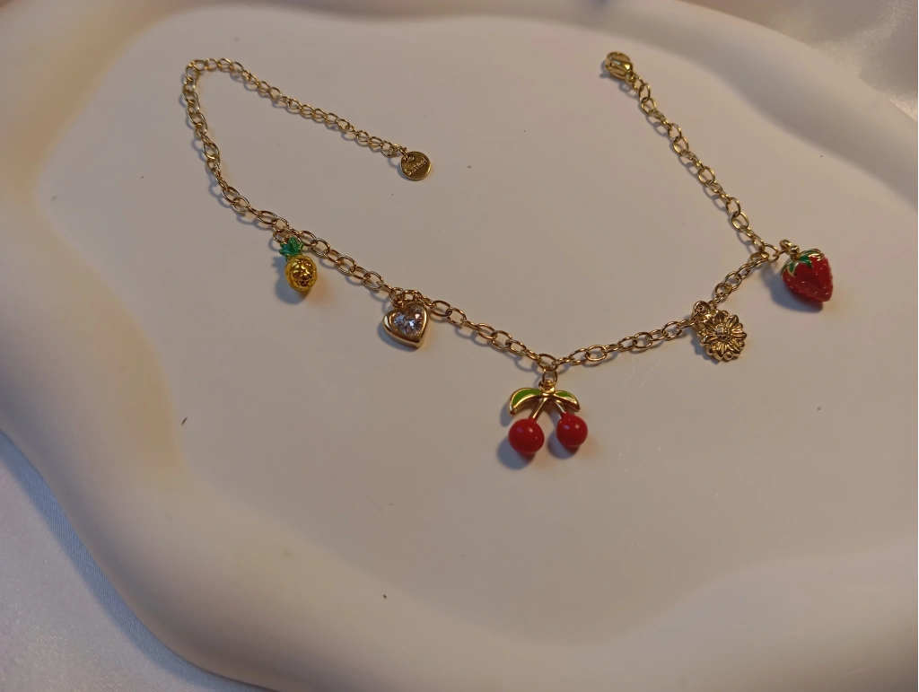 Tasarım: Halhal üzerinde canlı mine işçiliği ile renklendirilmiş çilek, kiraz ve ananas figürlerine; parıltılı kalp zirkon taş ve zarif güneş/çiçek motifi eşlik eder.