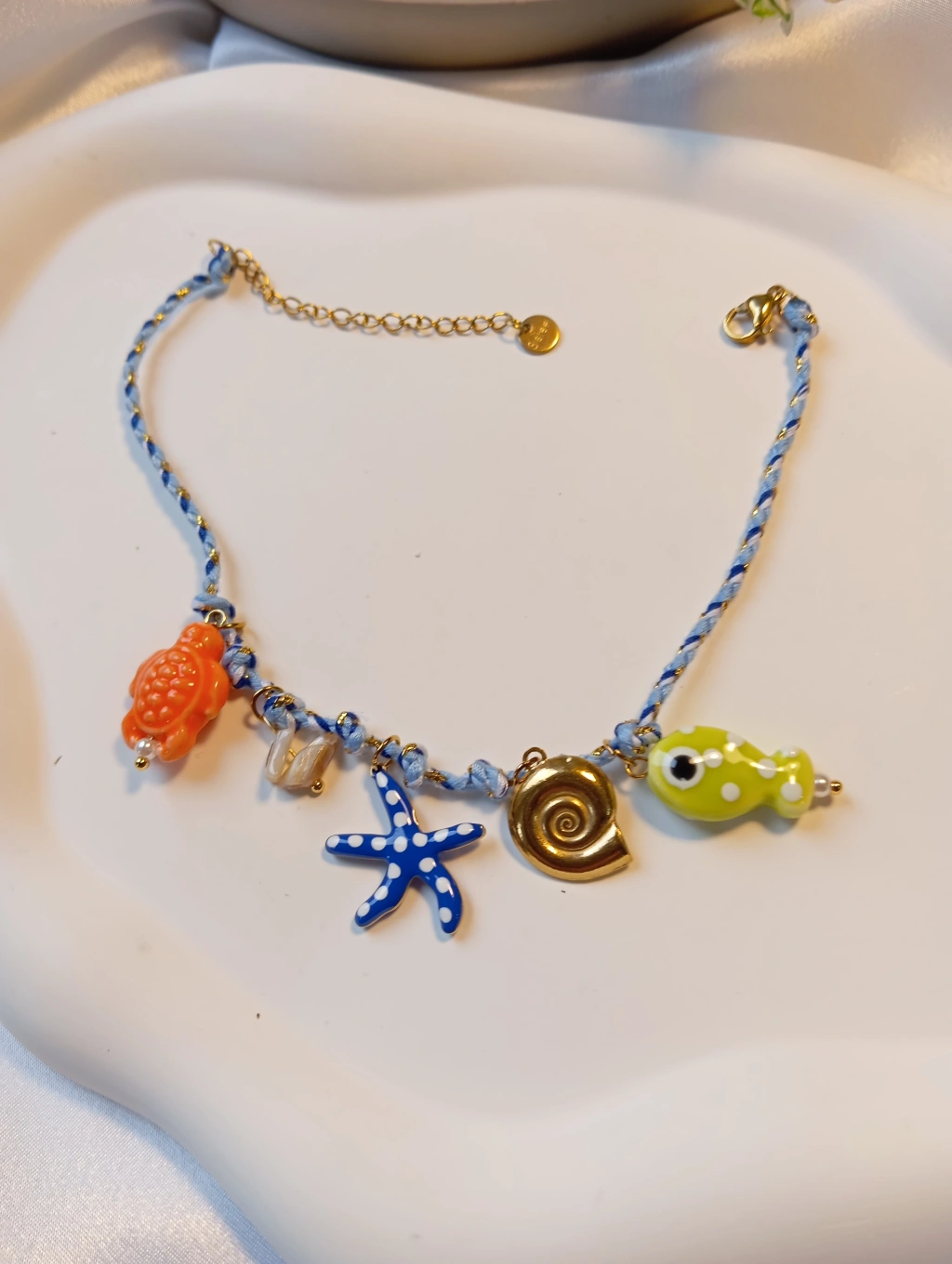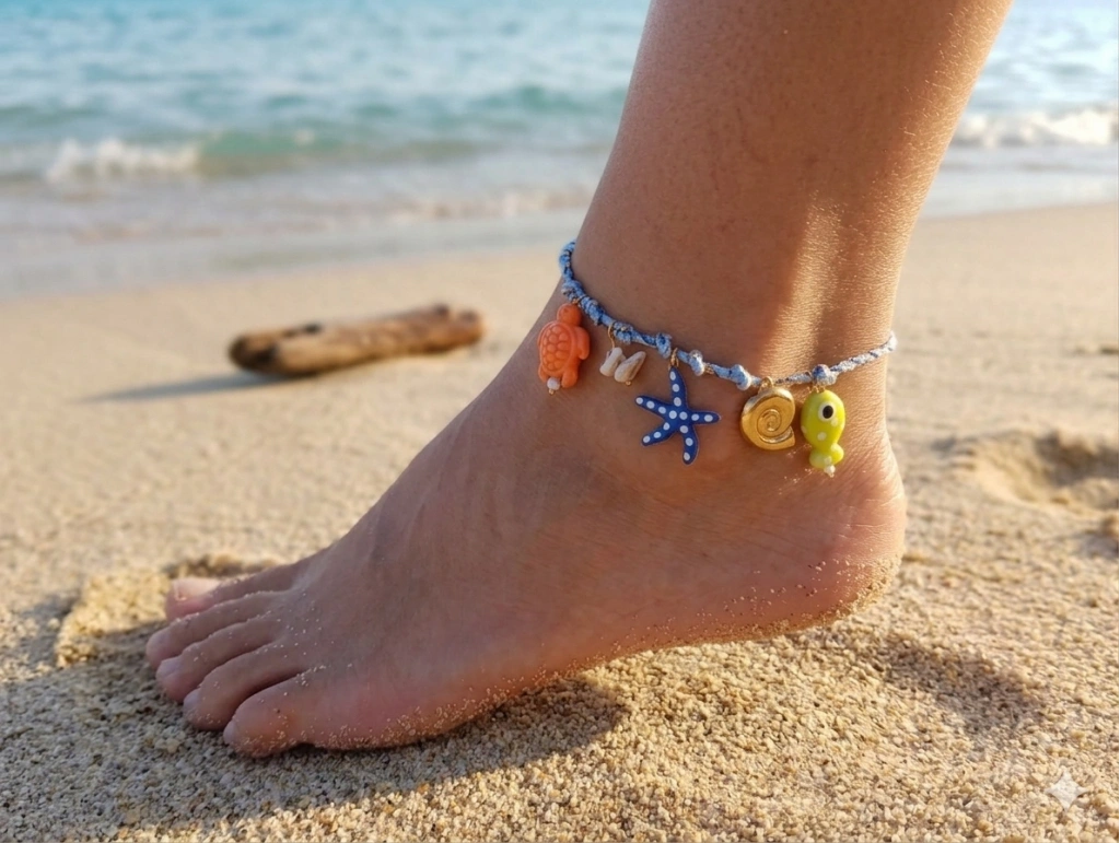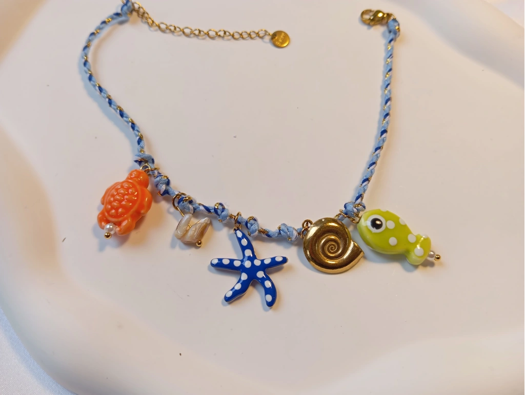 Denizin tüm neşesini ayak bileklerinize taşıyoruz! Euro Aksesuar’ın yeni sezon koleksiyonunda yer alan bu halhal; el yapımı görünümlü mavi örgü zinciri, sevimli turuncu kaplumbağa, mavi deniz yıldızı, sarı balık ve altın rengi sarmal kabuk figürleriyle dikkat çekiyor. Hem enerjik hem de zarif bir görünüm arayanlar için tasarlandı.