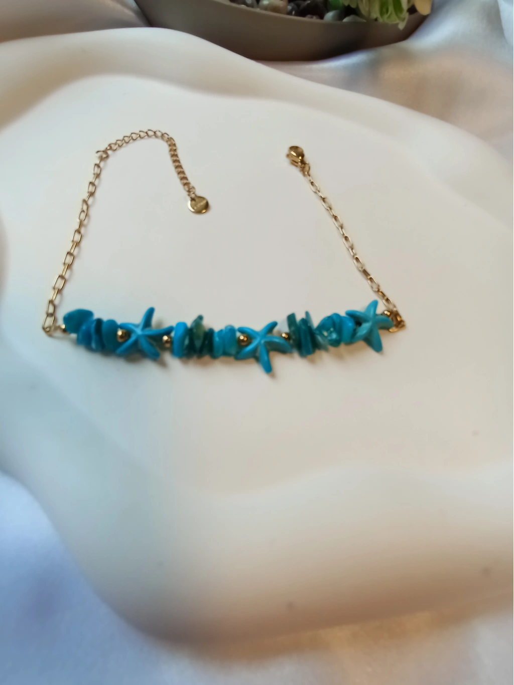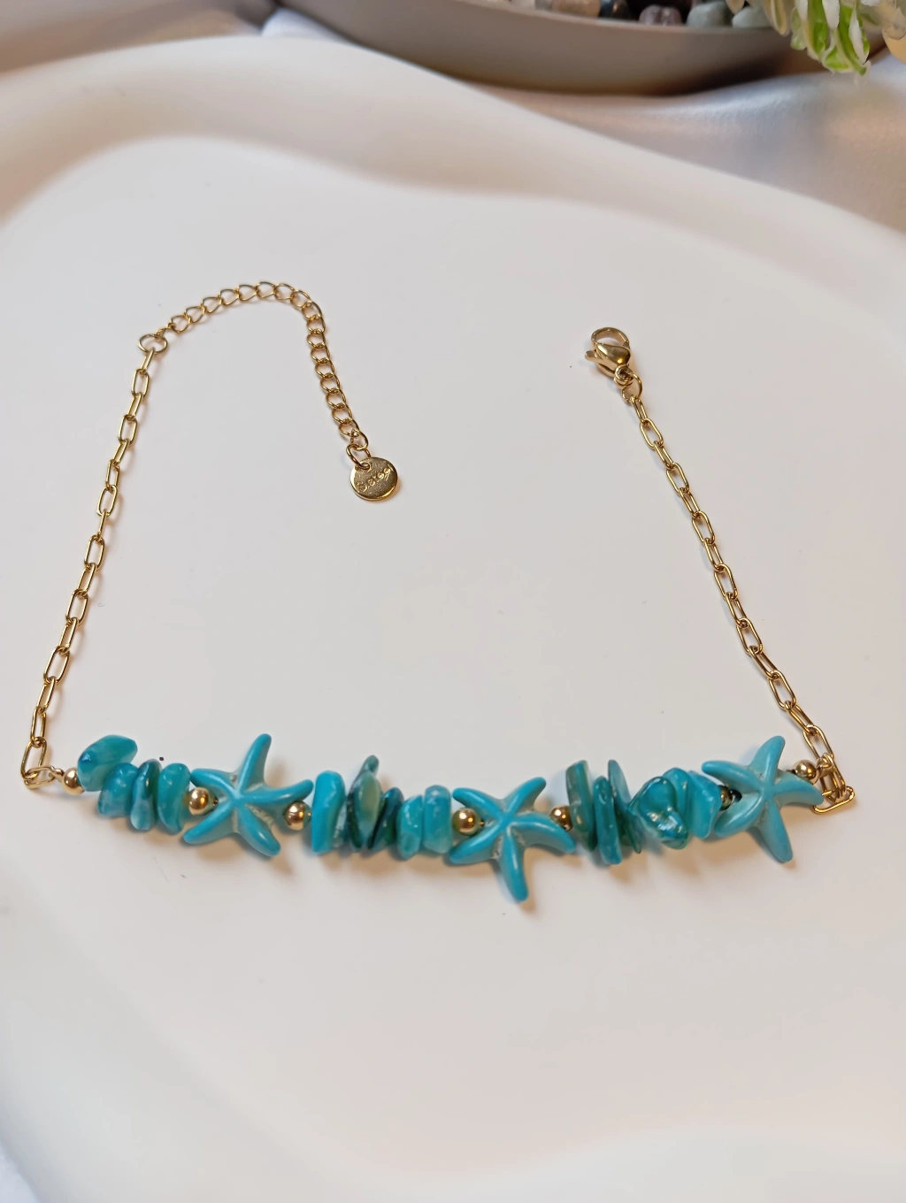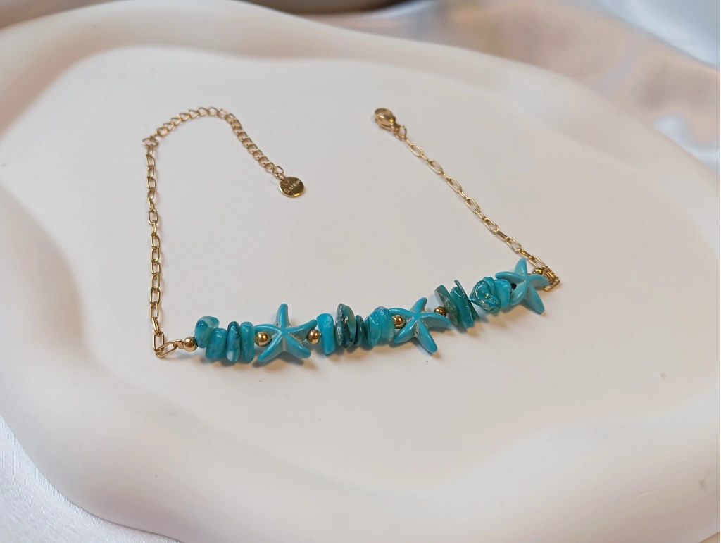 Detaylar: Doğal görünümlü turkuaz taşlar ve deniz yıldızı figürleri.