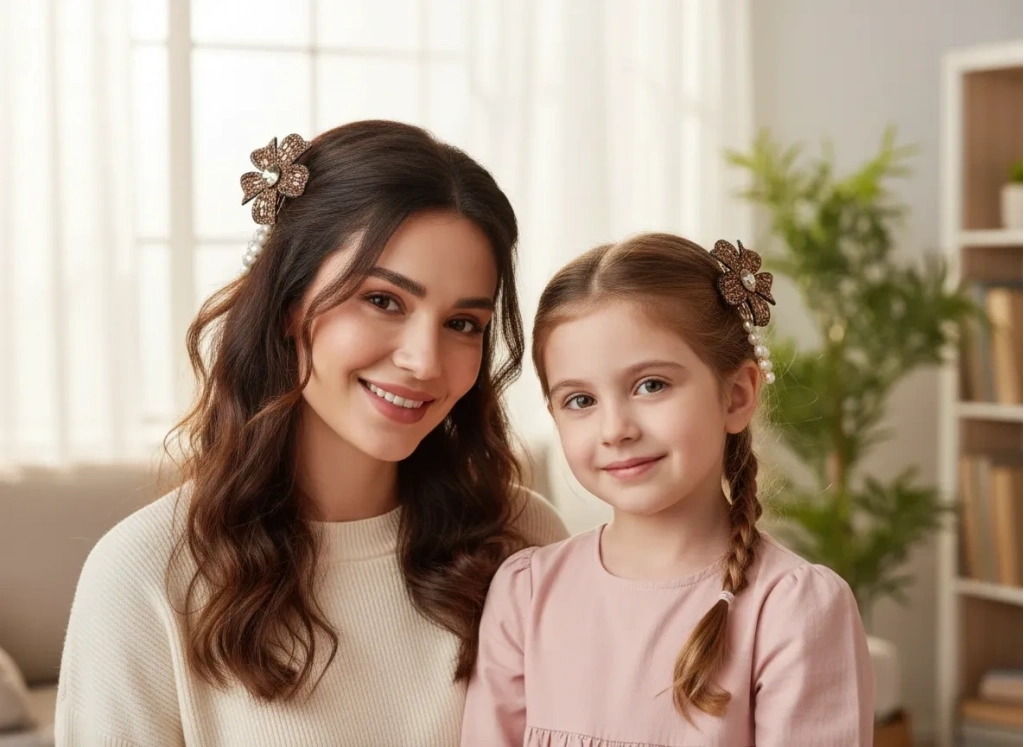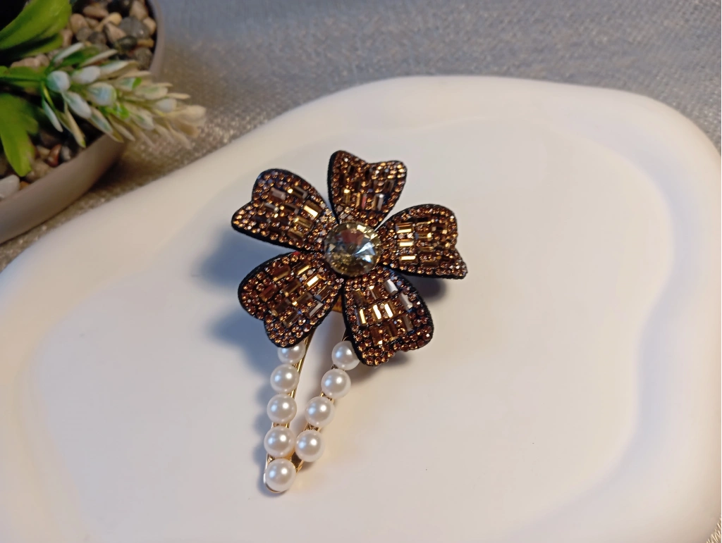 Zengin detayları ve sofistike tasarımıyla öne çıkan bu lüks yan toka, stilinize asil bir dokunuş katıyor. Altın rengi metal gövde üzerinde yükselen dört yapraklı çiçek figürü, ışıltılı kahverengi kristal taşlar ve merkezindeki büyük prizmatik taş ile tam bir görsel şölen sunuyor. Tokanın alt kısmını süsleyen sıralı inci detayları ise modern tasarıma klasik bir zarafet ekliyor. Güçlü tutuş sağlayan pens mekanizması, en yoğun saçlarda bile gün boyu konforlu bir kullanım sunar. Özel davetlerden şık akşam yemeklerine kadar her anınıza eşlik edecek bu özel parça, Euro Aksesuar kalitesini yansıtıyor.
