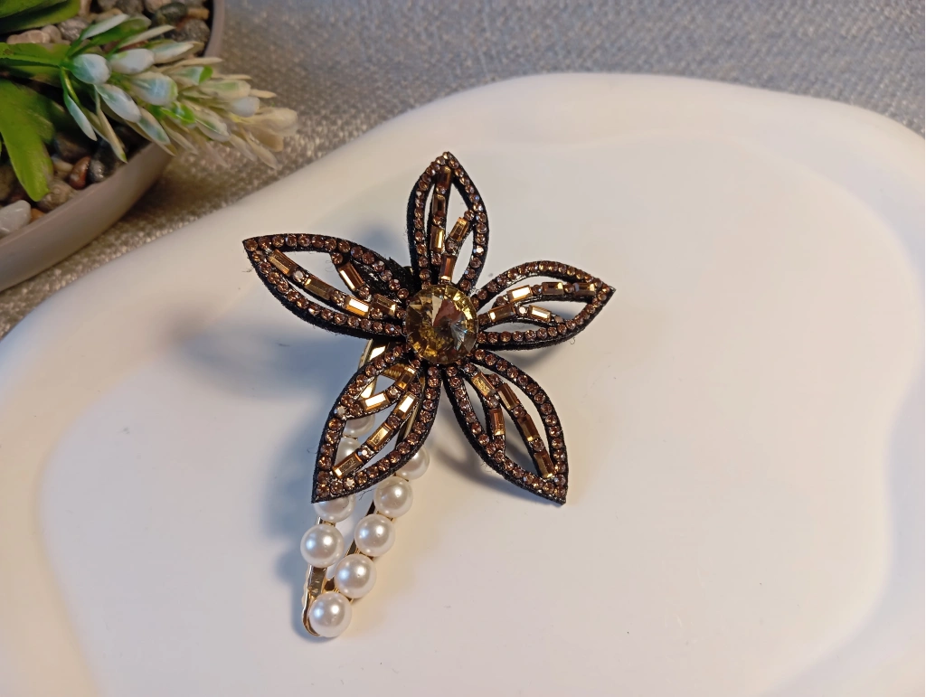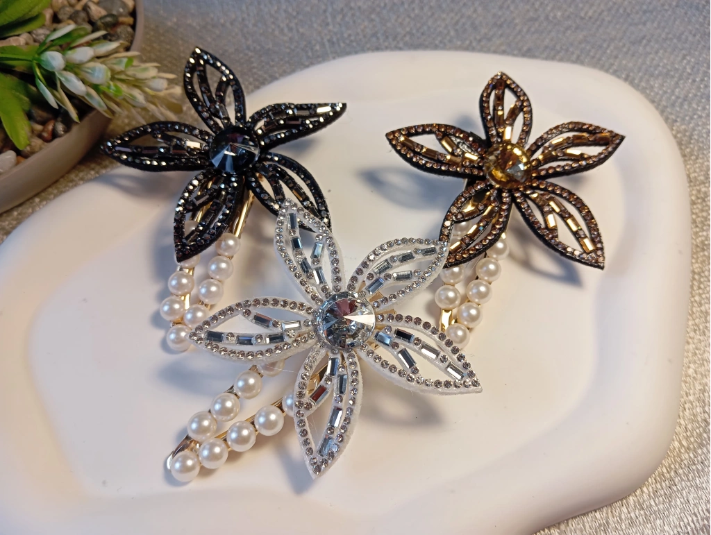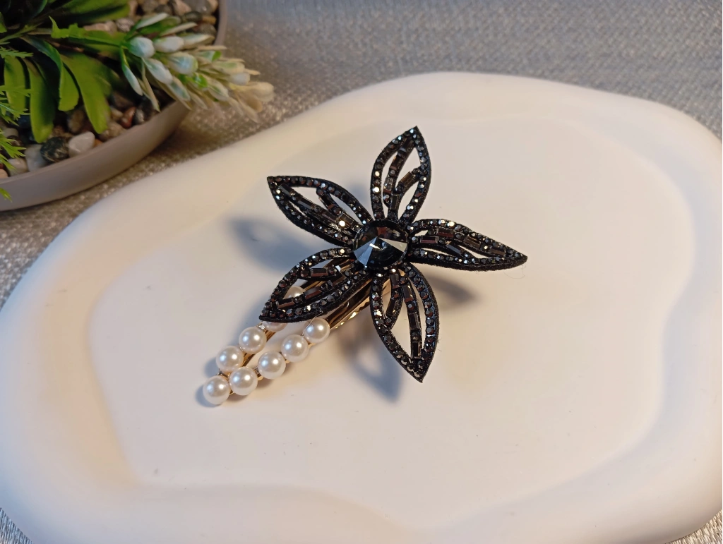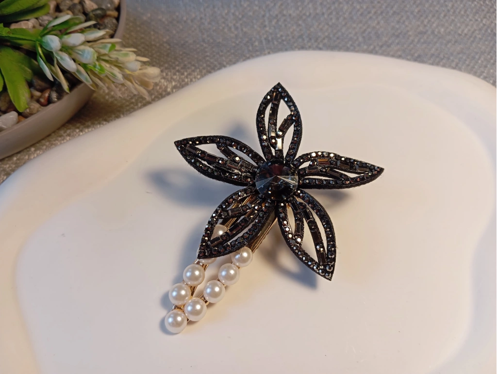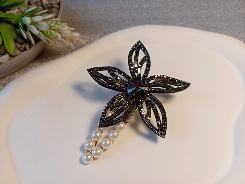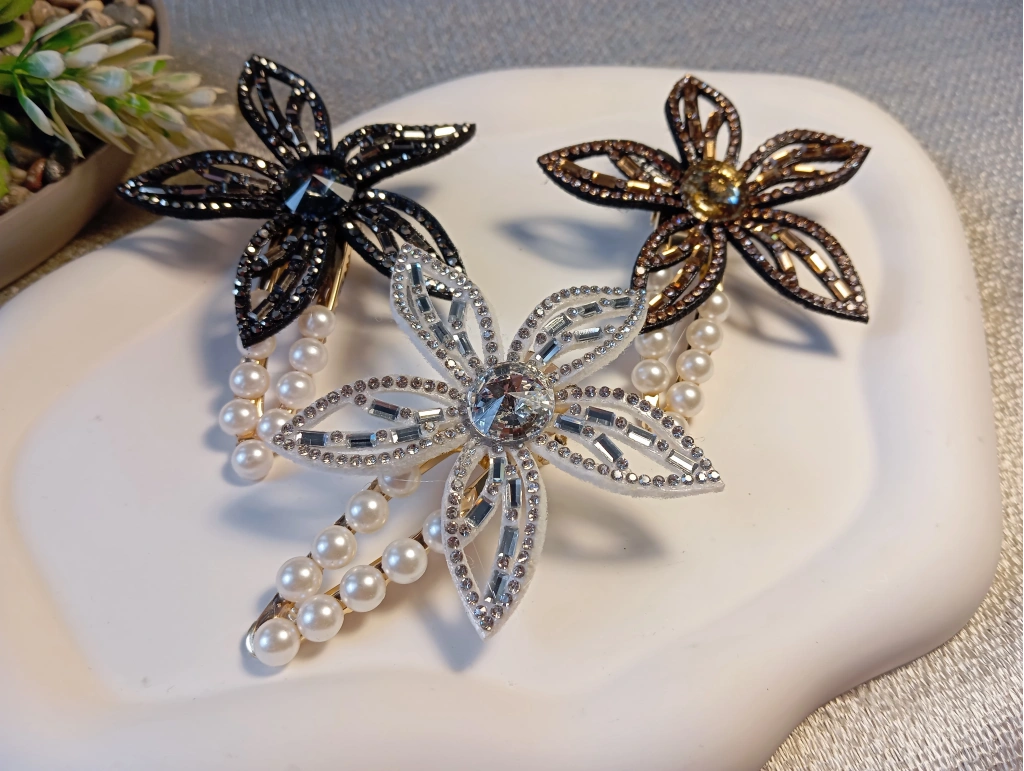 Euro Aksesuar Kristal Taşlı Çiçek Figürlü ve İncili Lüks Yan Toka Seti (Siyah, Gold, Gümüş)