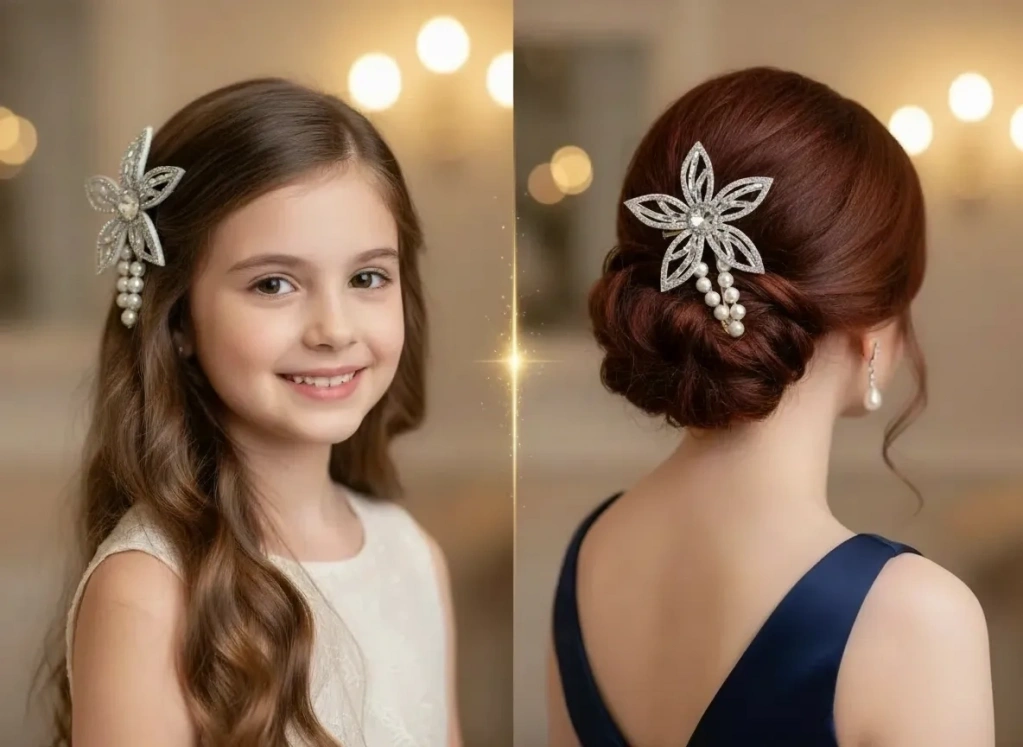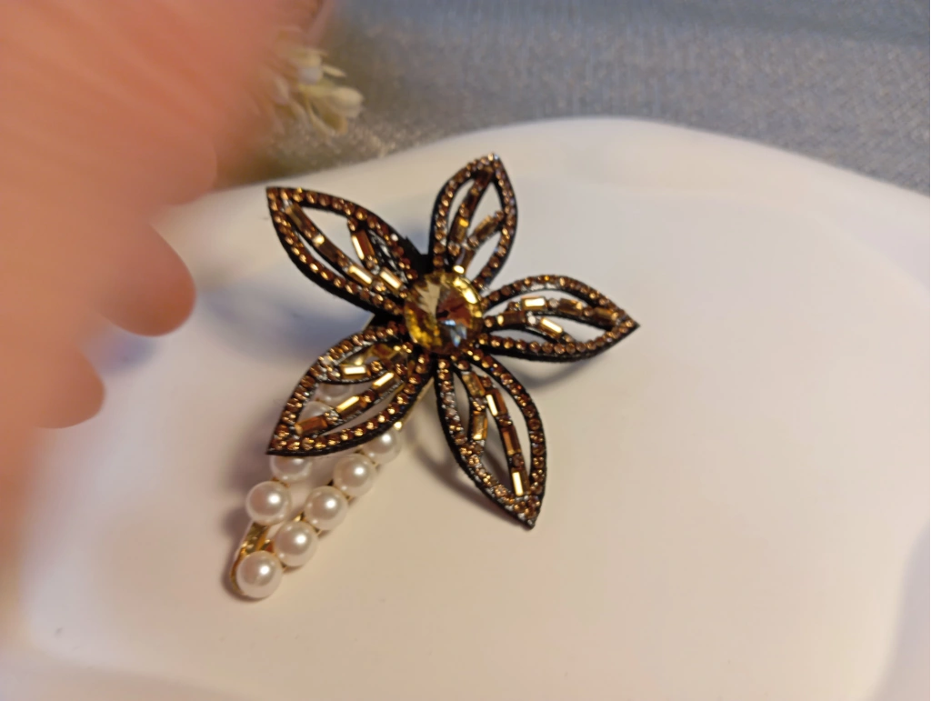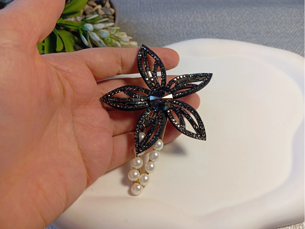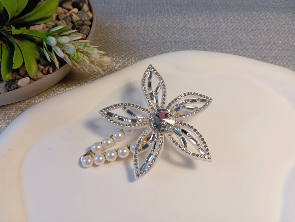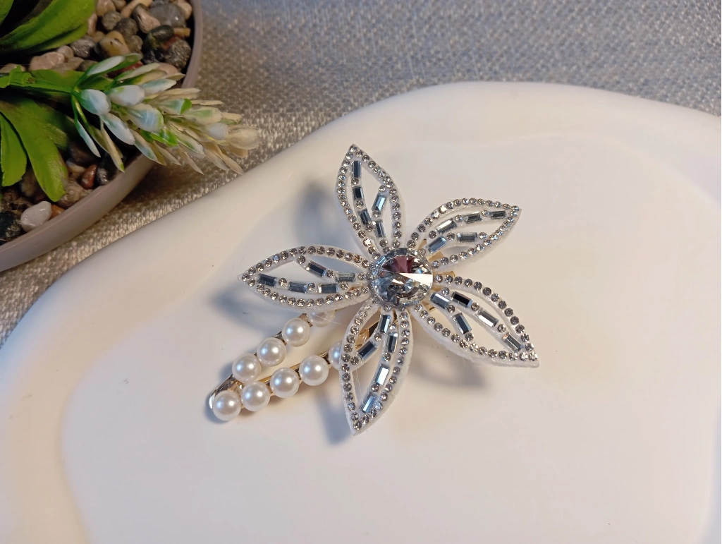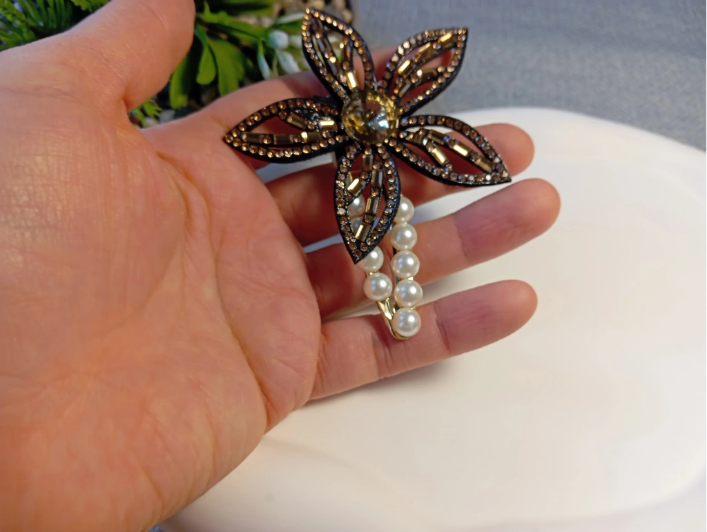Euro Aksesuar Kristal Taşlı Çiçek Figürlü ve İncili Lüks Yan Toka Seti (Siyah, Gold, Gümüş)
