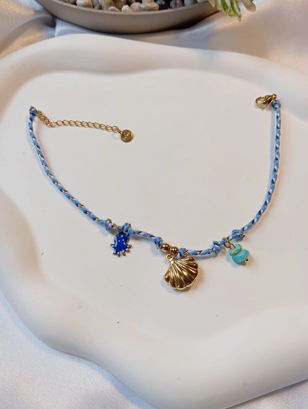 Euro Aksesuar Marin Serisi Altın Kaplama İstiridye ve Ahtapot Figürlü Mavi Örgü Halhal