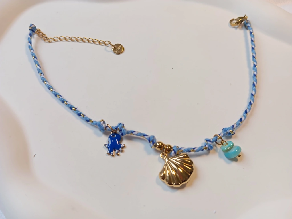 Yazın enerjisini ve denizin huzurunu bileklerinizde hissedin! Euro Aksesuar'ın marin koleksiyonuna ait bu özel tasarım halhal, zarif mavi örgü zinciri ve altın rengi deniz figürleriyle stilinize hareket katar. Detaylarındaki turkuaz taş ve sevimli mavi ahtapot figürü, el işçiliği zarafetini modern tasarımla birleştiriyor.