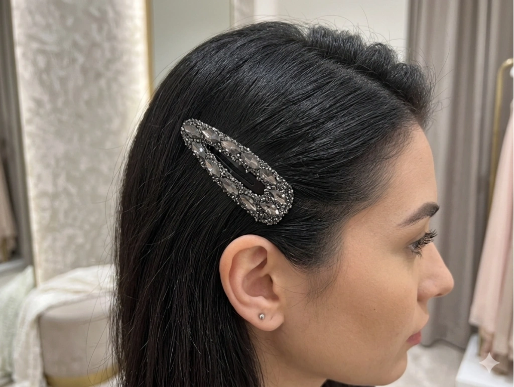 Asil Renk Tonu: Koyu gri ve antrasit yansımalı taşları sayesinde her saç renginde belirgin ve lüks bir duruş sergiler.