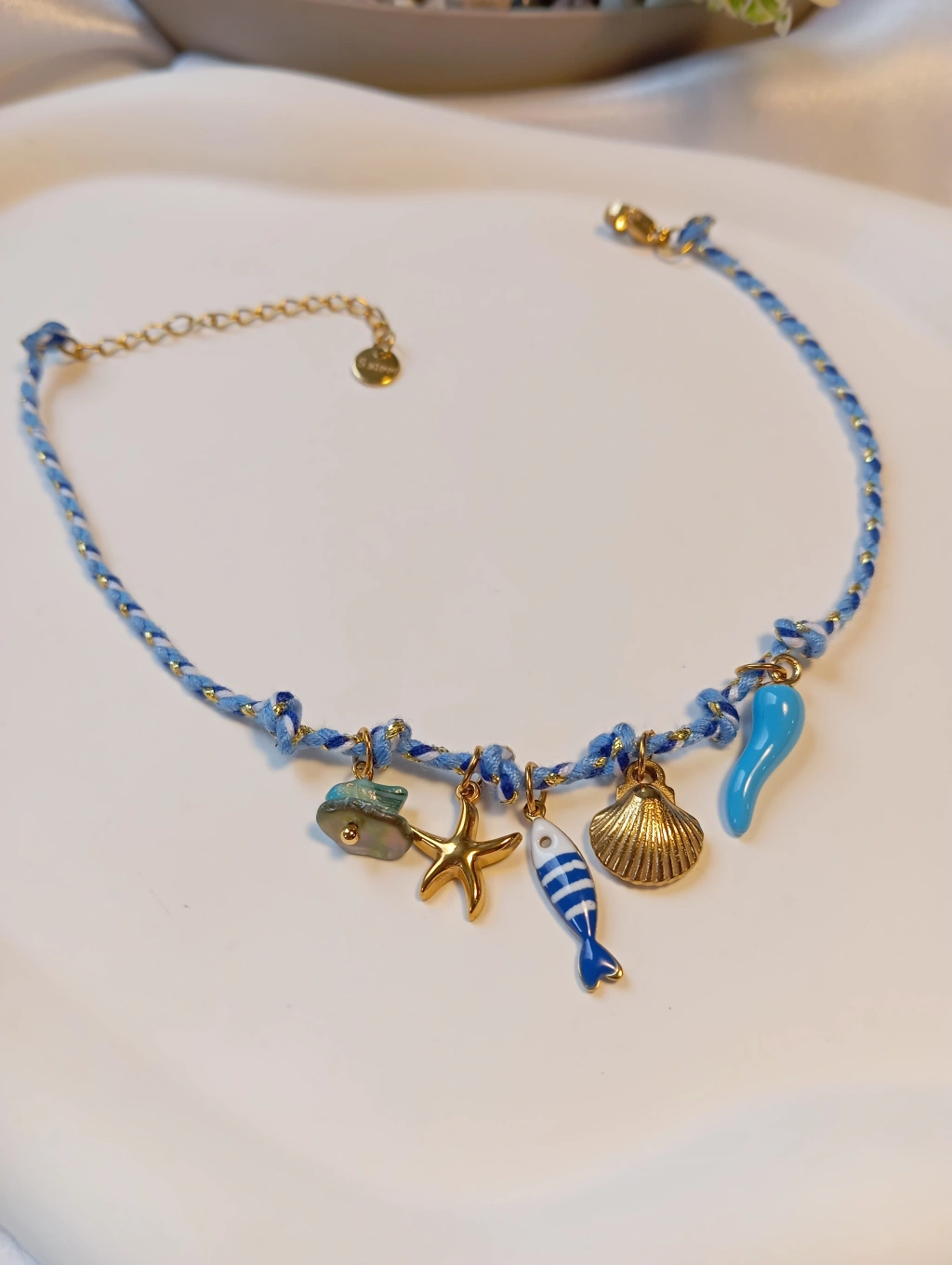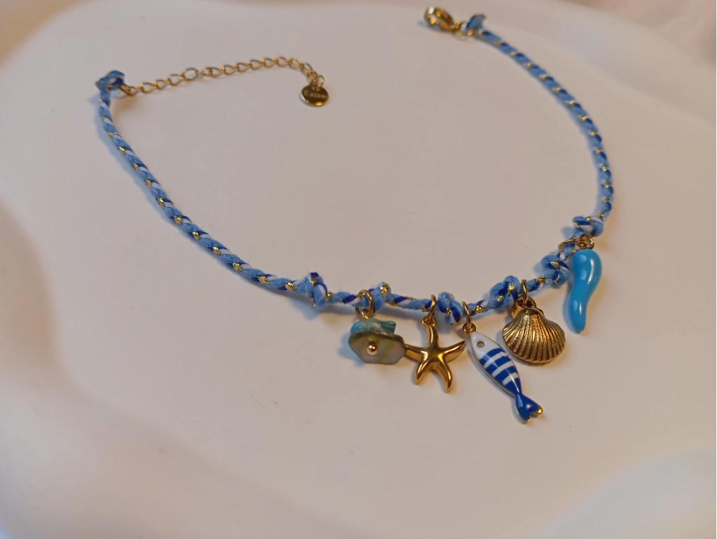 Deniz yıldızı, midye kabuğu ve sevimli balık figürleriyle zenginleştirilmiş bu mavi halhal, yaz kombinlerinizin en canlı parçası olmaya aday. Dayanıklı çelik yapısı ve altın rengi detaylarıyla hem şıklığı hem de uzun ömürlü kullanımı bir arada sunuyor.