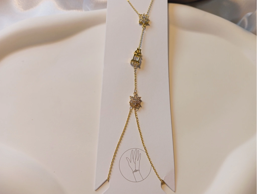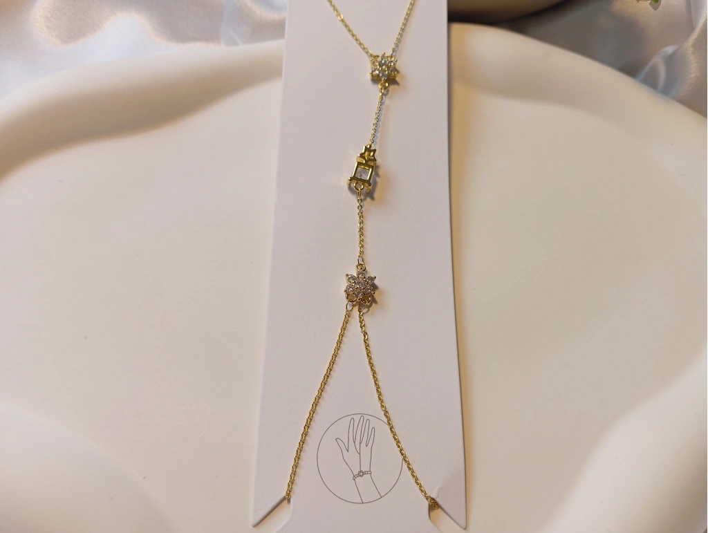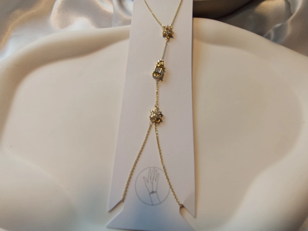 Euro Aksesuar'ın "Luxury Jewelry" koleksiyonundan çıkan bu gold kaplama şahmeran, geleneksel el şahmeranı estetiğini modern ve ışıltılı figürlerle buluşturuyor. Parmaktan bileğe uzanan bu zarif zincir, elinizi üç farklı ve göz alıcı tasarımla süslüyor.
