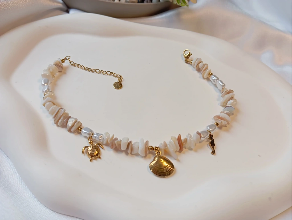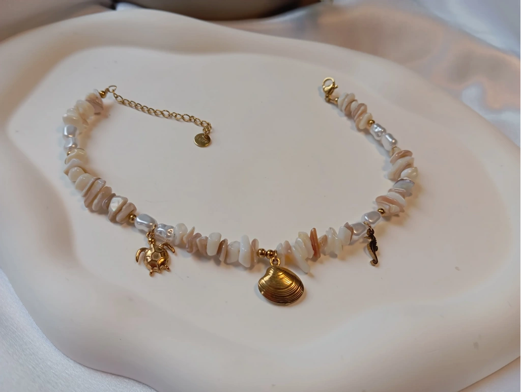 Doğallığın ve deniz esintisinin mükemmel uyumu bu halhalda hayat buluyor. Krem tonlarındaki asimetrik kesim taş dizilimi, inci detayları ve gold rengi deniz canlıları (kaplumbağa, midye kabuğu, deniz atı) ile stilinize zarif bir dokunuş katın. Yaz akşamlarının ve plaj şıklığının en favori parçası olmaya aday.