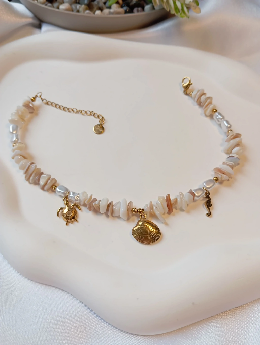Tasarım: Krem rengi parçalı taşlar, aralarda parlak inciler ve gold sallantılı marin figürleri.