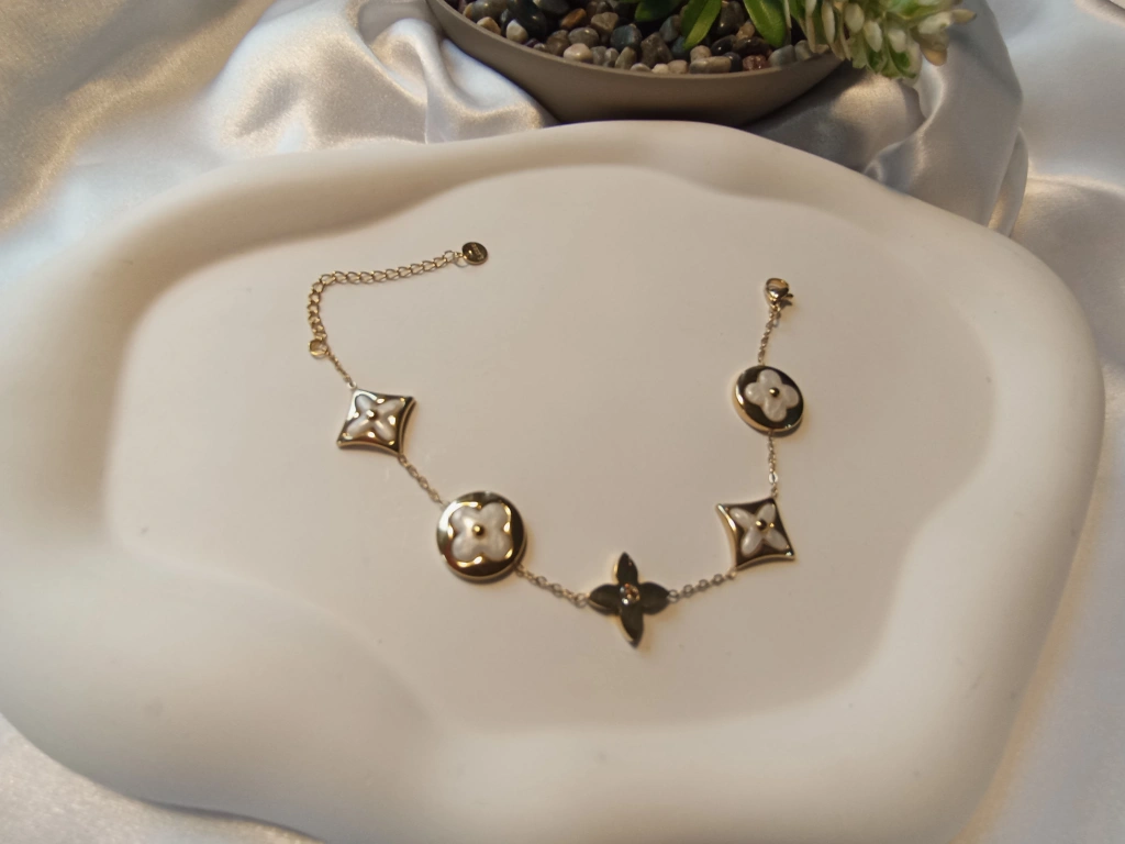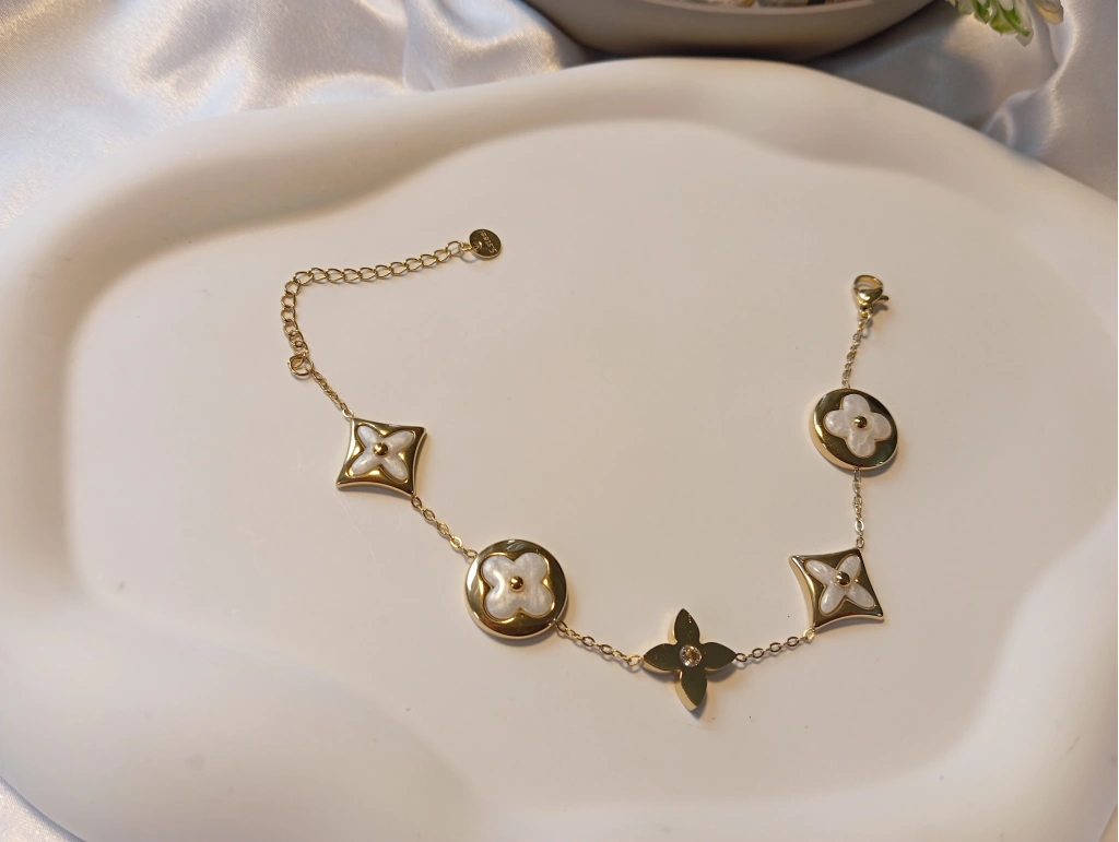 Gold Yonca Detaylı Çelik Bileklik modelimiz antialerjiktir. Günlük kullanıma uygundur. Çelik üzeri altın kaplamadır. Su ile temasında kararma yapmaz. Denizde, duşta, havuzda kullanımda %90 a kadar kararmaya karşı koruma sağlar. Uzun süre kullanım için kolonya, parfüm, dezenfektan vb. ürünlerden korunması önerilir.