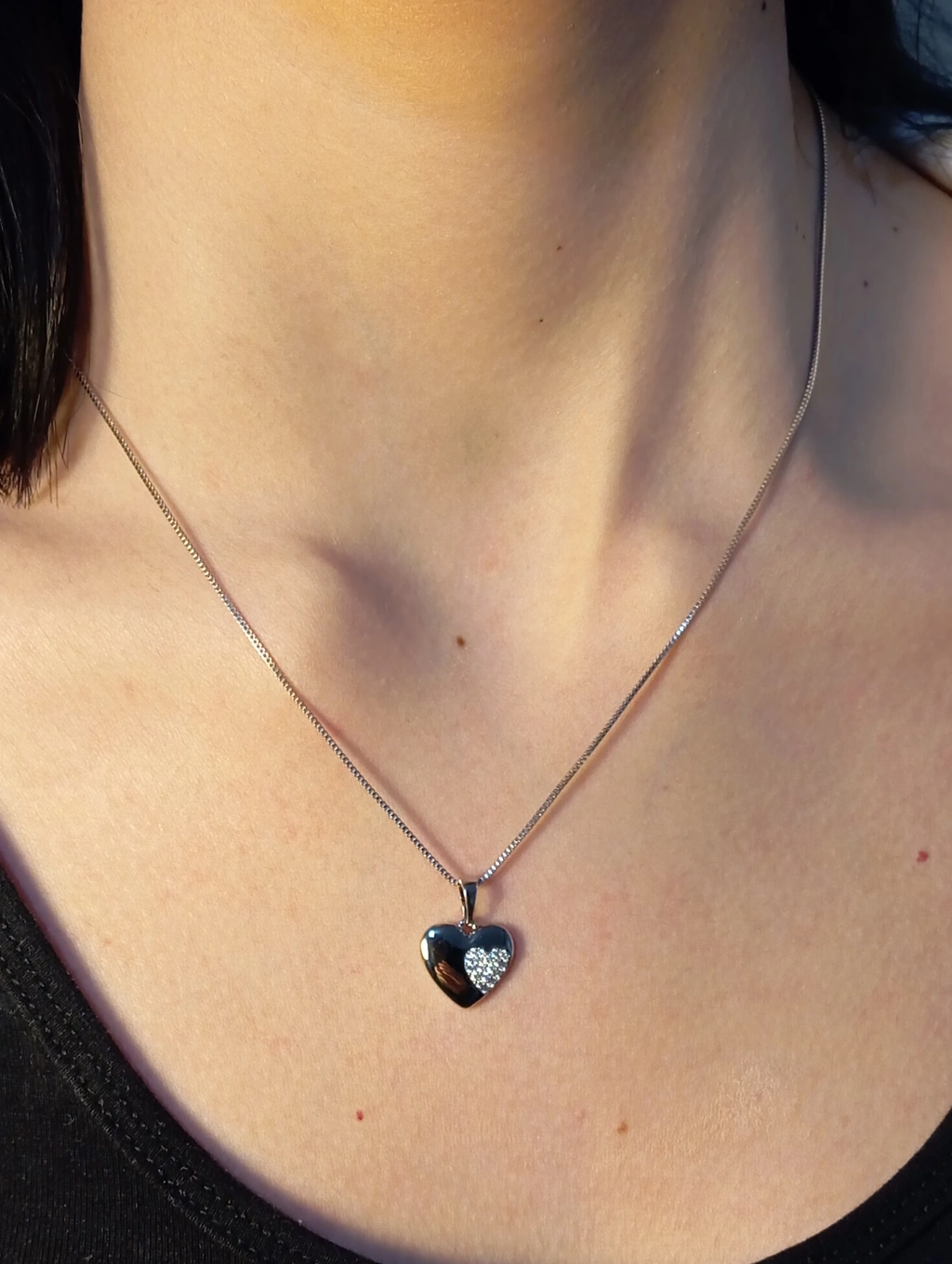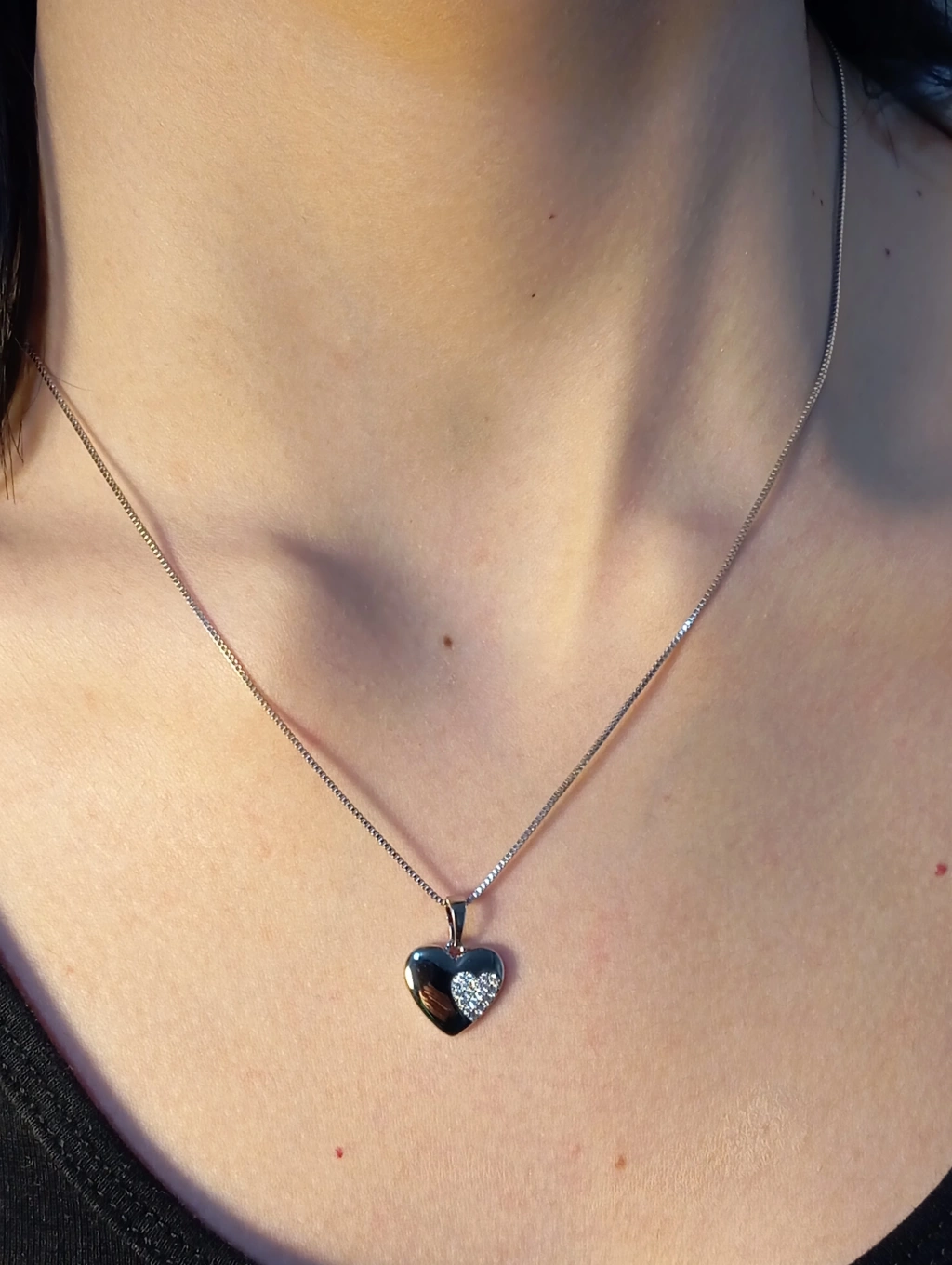 Gümüş renginin asaletini, kalbin üzerine işlenmiş pırlanta parlaklığındaki zirkon taşlarla birleştiren bu model, boynunuzda narin bir ışıltı yaratır. 45 cm uzunluğundaki zinciri, köprücük kemiği hizasında durarak (prenses boy) hem V yaka bluzlarla hem de kazaklarla mükemmel uyum sağlar.