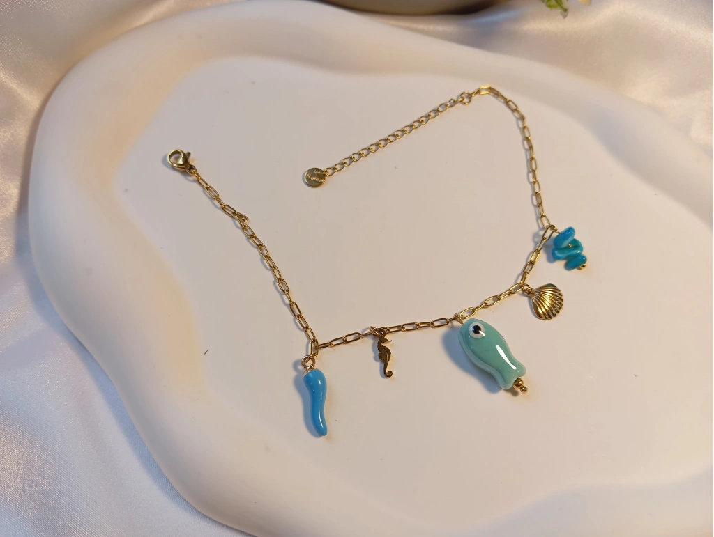 Denizden gelen zarafeti ayak bileklerinize taşıyın. İnce gold zinciri üzerinde yer alan turkuaz mavisi balık, nazar boncuğu detayı ve altın sarısı midye kabuğu figürleriyle bu halhal, yazın en şık tamamlayıcısı olacak. Hem şans getiren figürleri hem de marin temasıyla kombinlerinize canlılık katar.