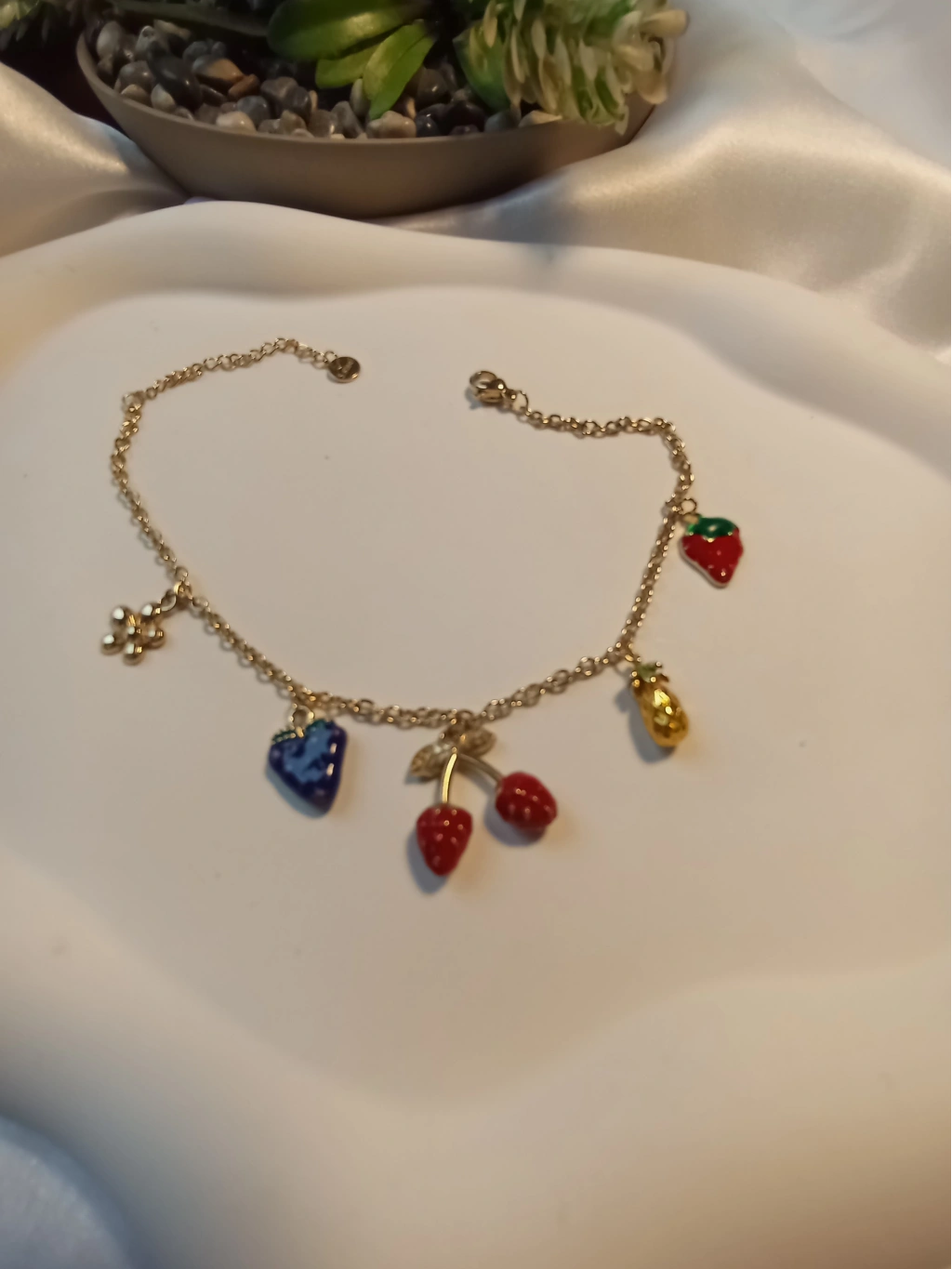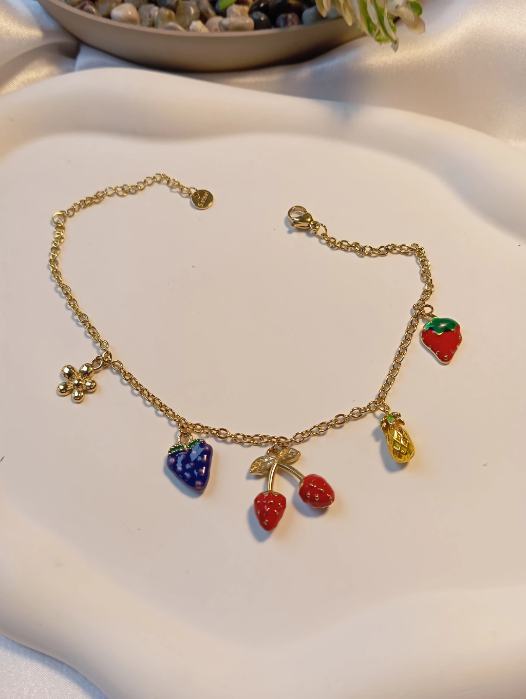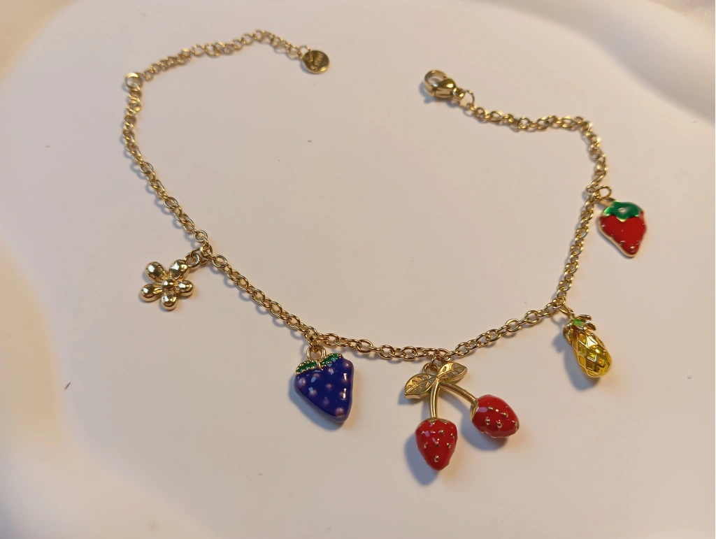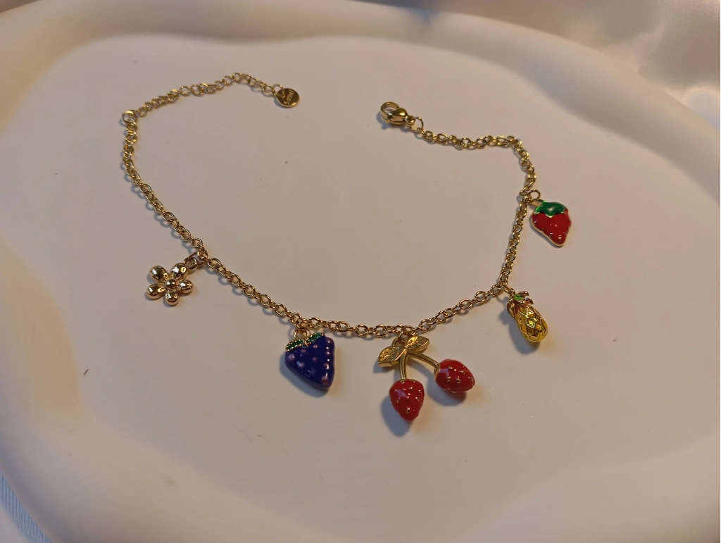 Yazın enerjisini ve neşesini ayak bileklerinize taşıyın! Çilek, kiraz, ananas ve çiçek figürleriyle süslenmiş bu canlı tasarım, mineli detayları ve gold zinciriyle göz kamaştırıyor. Hem eğlenceli hem de zarif bir aksesuar arayanlar için ideal bir seçim.