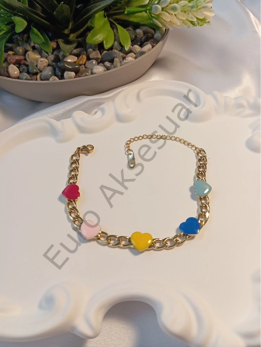 Renkli Kalp DEtaylı Çelik Bileklik ntialerjiktir. Günlük kullanıma uygundur. Denizde, duşta, havuzda kullanımda %90 a kadar kararmaya karşı koruma sağlar. Uzun süre kullanım için kolonya, dezenfektan,parfüm vb. ürünlerden korunması önerilir.