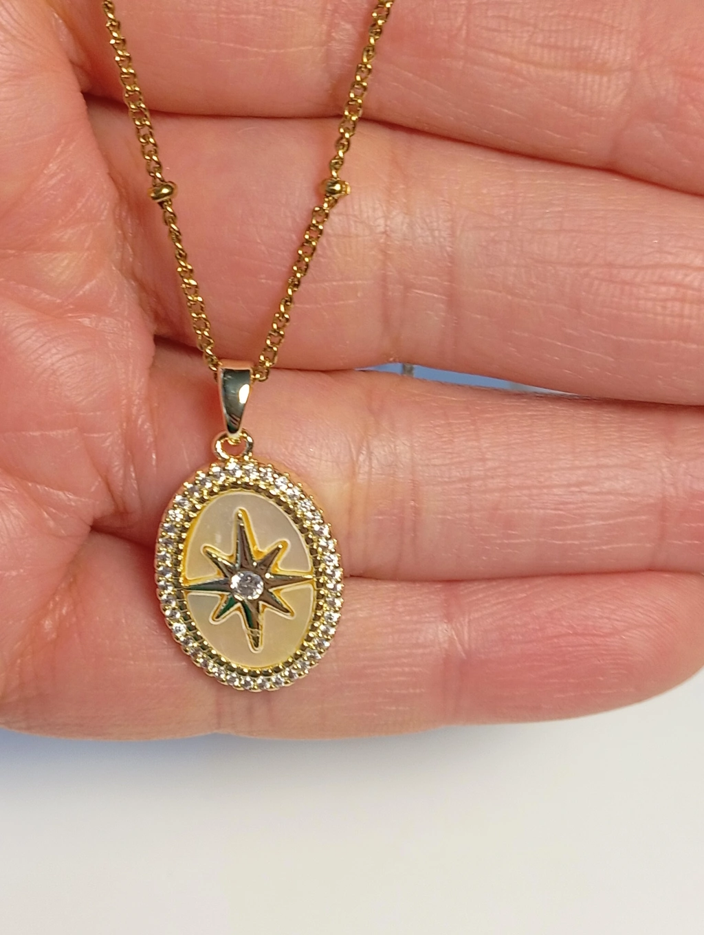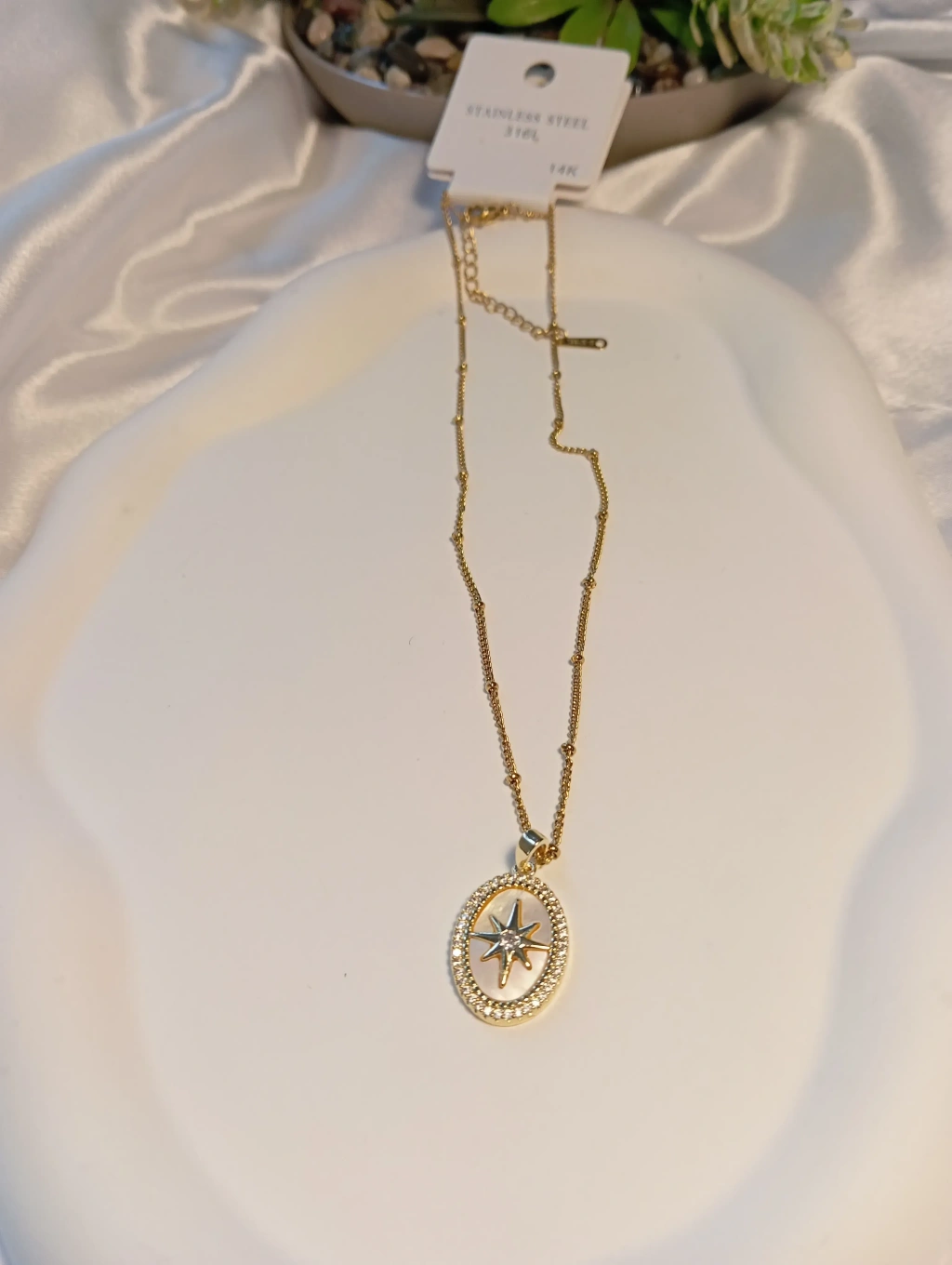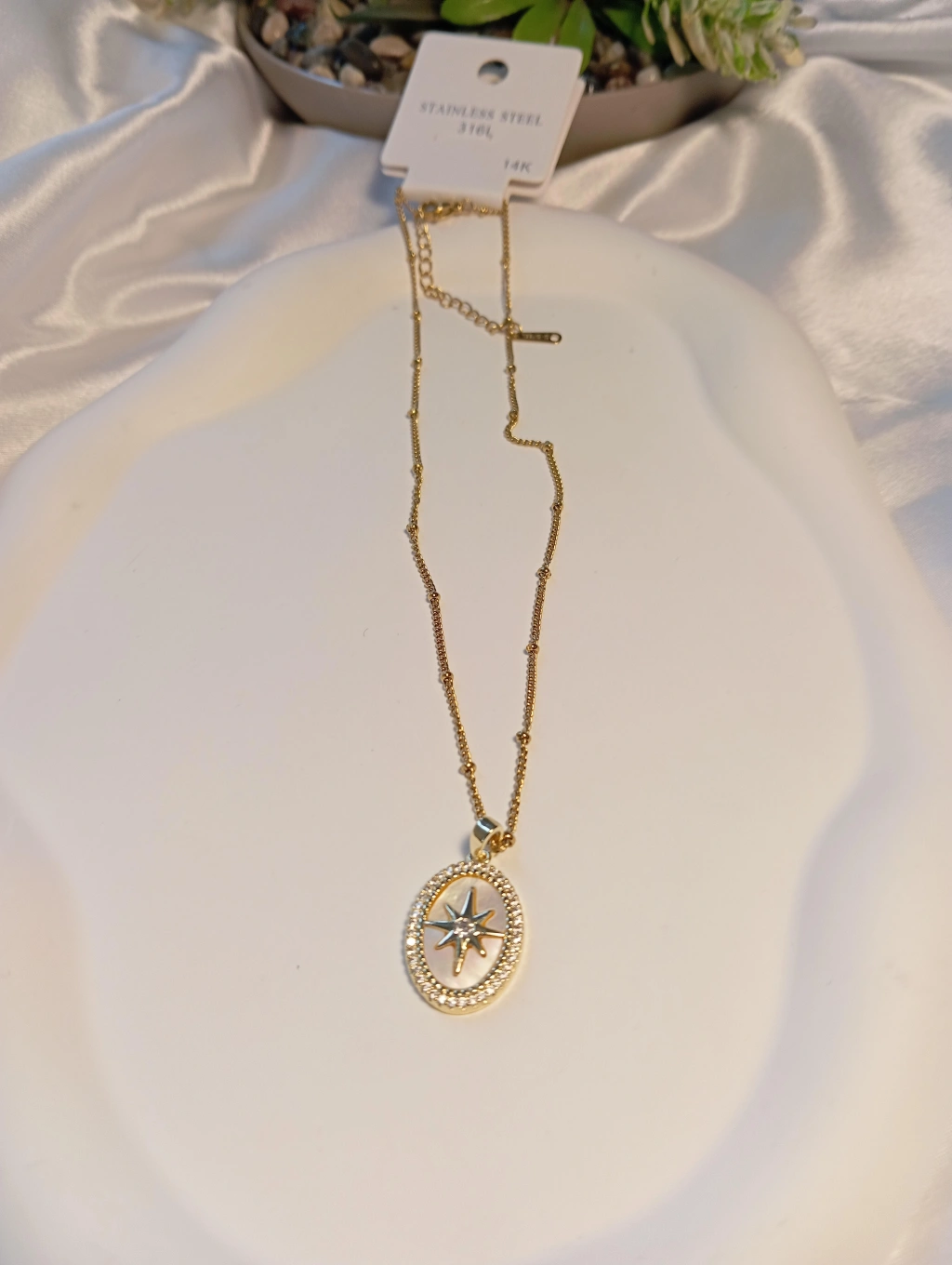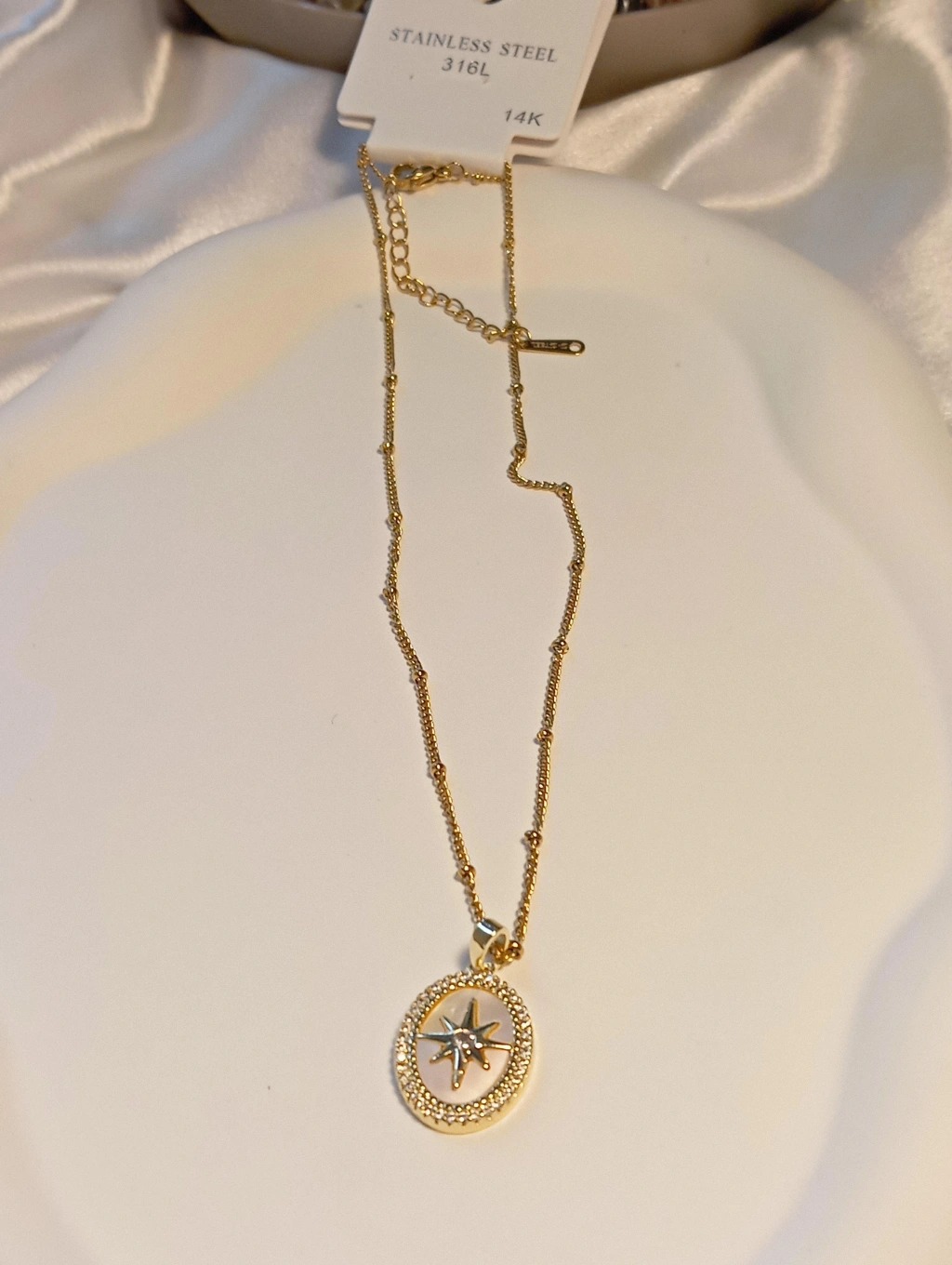 Ürün Adı: Sedefli Kutup Yıldızı Model Çelik Kolye, 14K Altın Kaplama