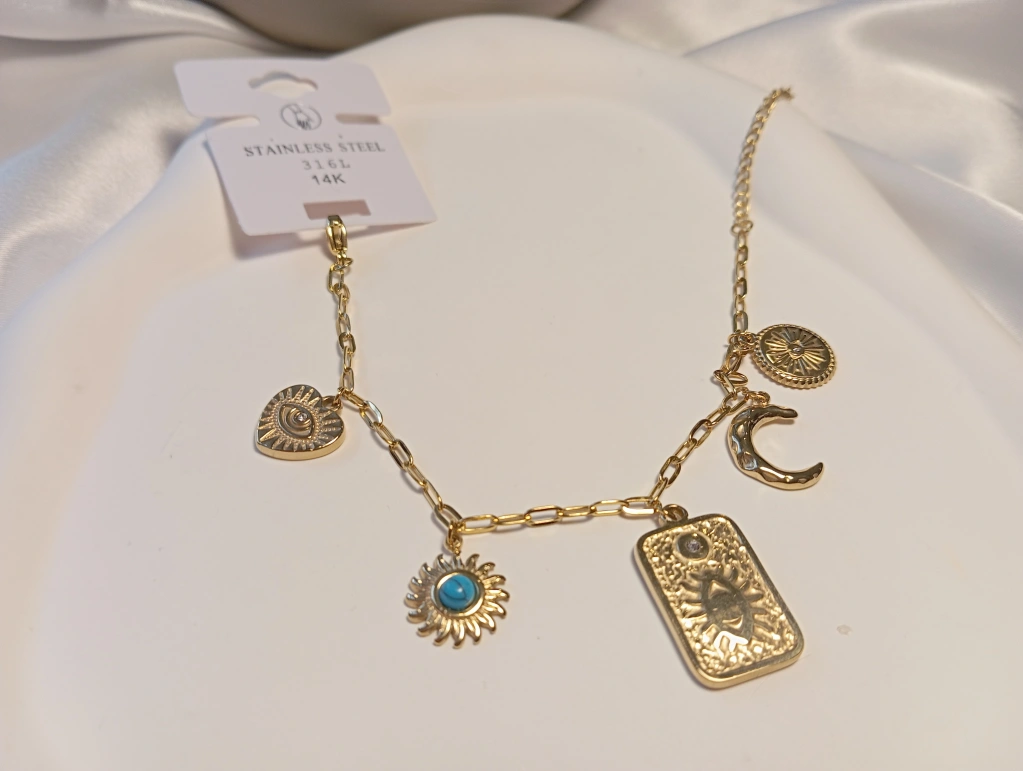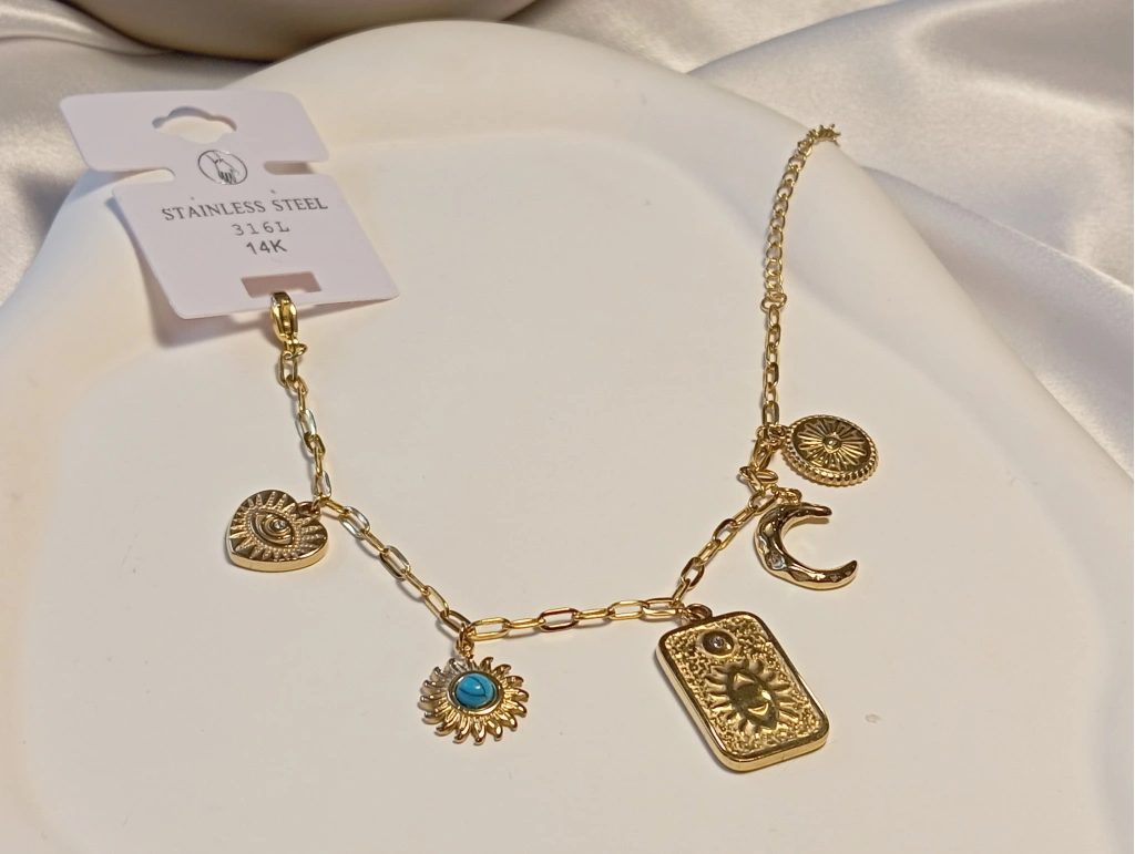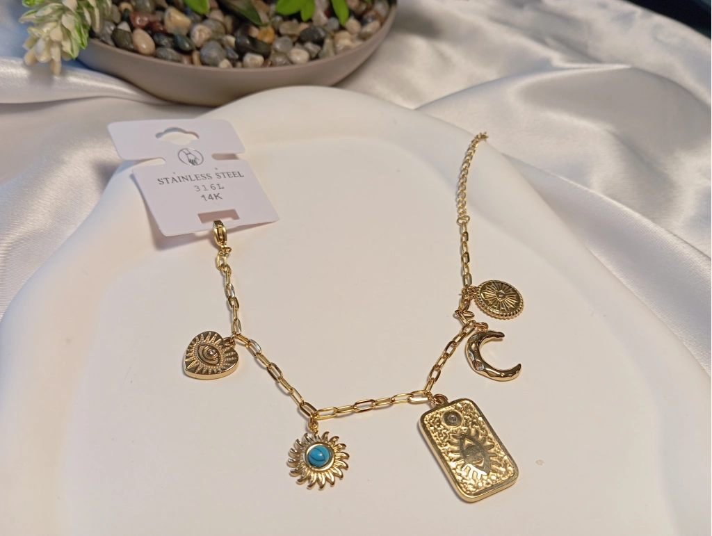 Tasarım: İnce zincir üzerine dizilmiş zarif figürler ve güneş figüründe bulunan turkuaz taş detayı ile hareketlendirilmiştir.