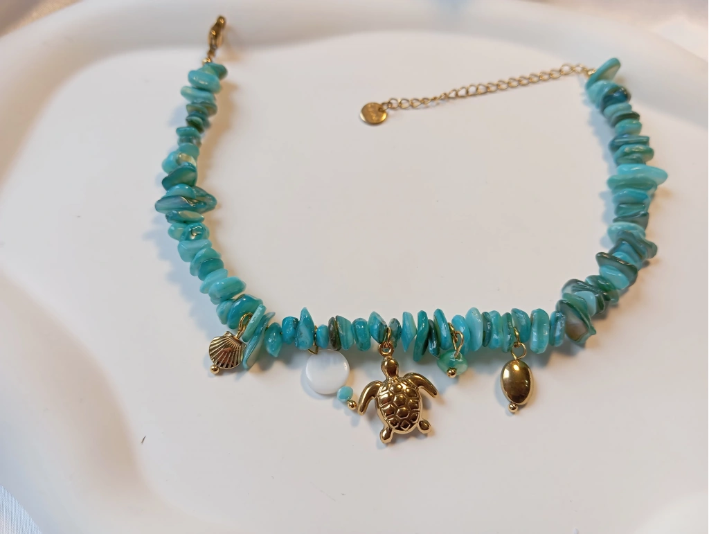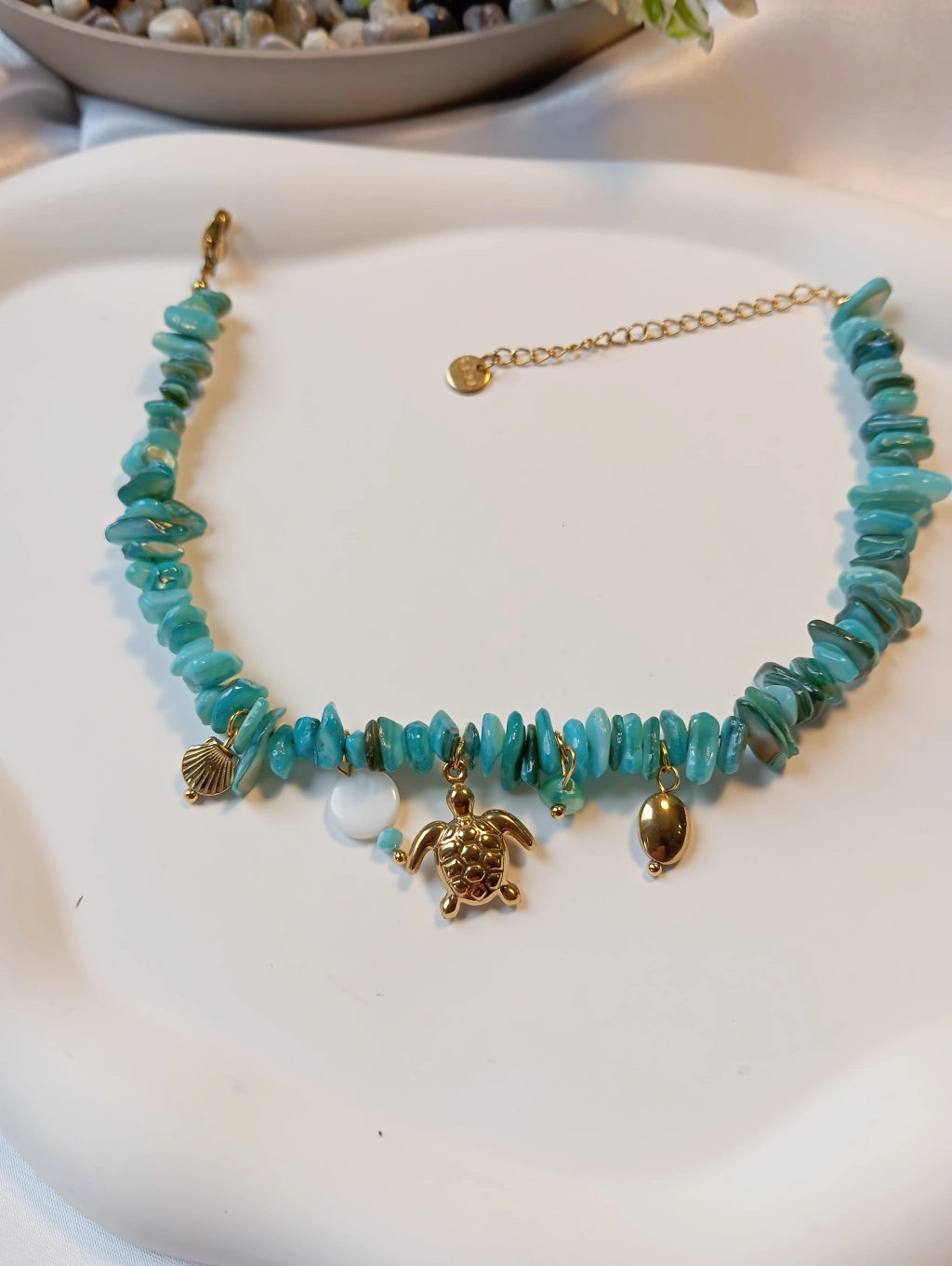 Tasarım: Turkuaz rengi parçalı taşlar ve gold renkli sallantılı deniz figürleri.