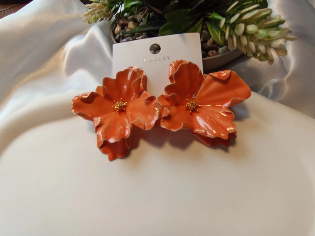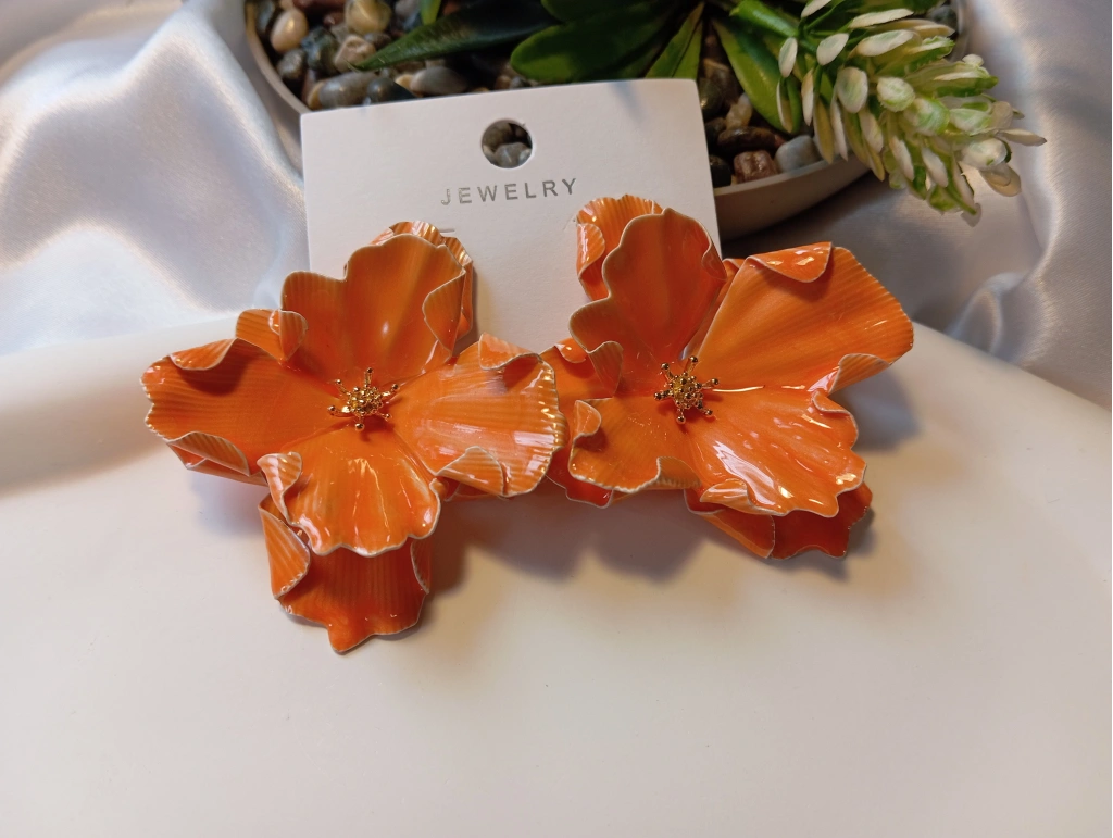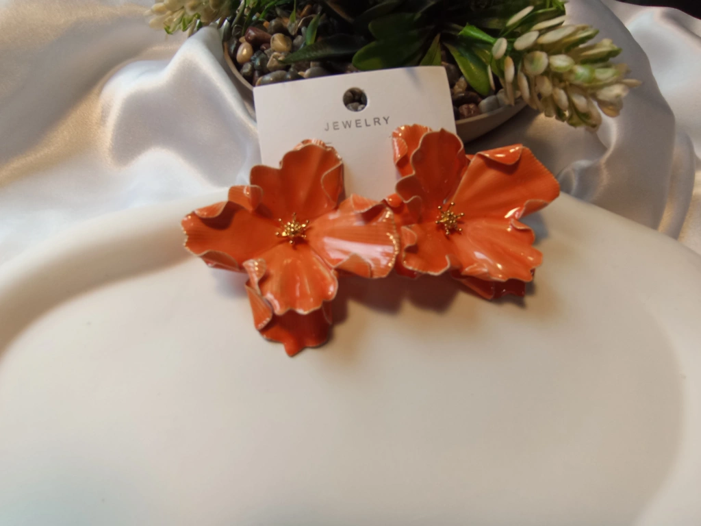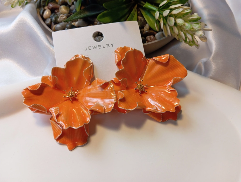 Turuncu Emaye İşlemeli Büyük Çiçek Tasarım Bijuteri Küpe (5,5 cm)