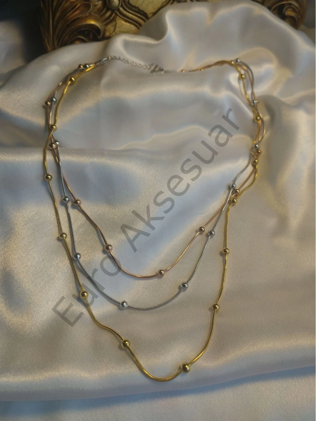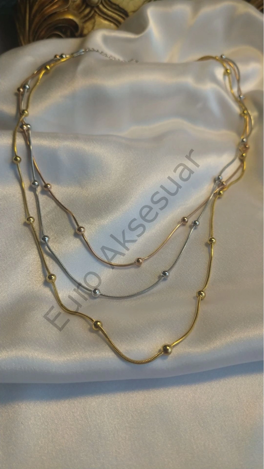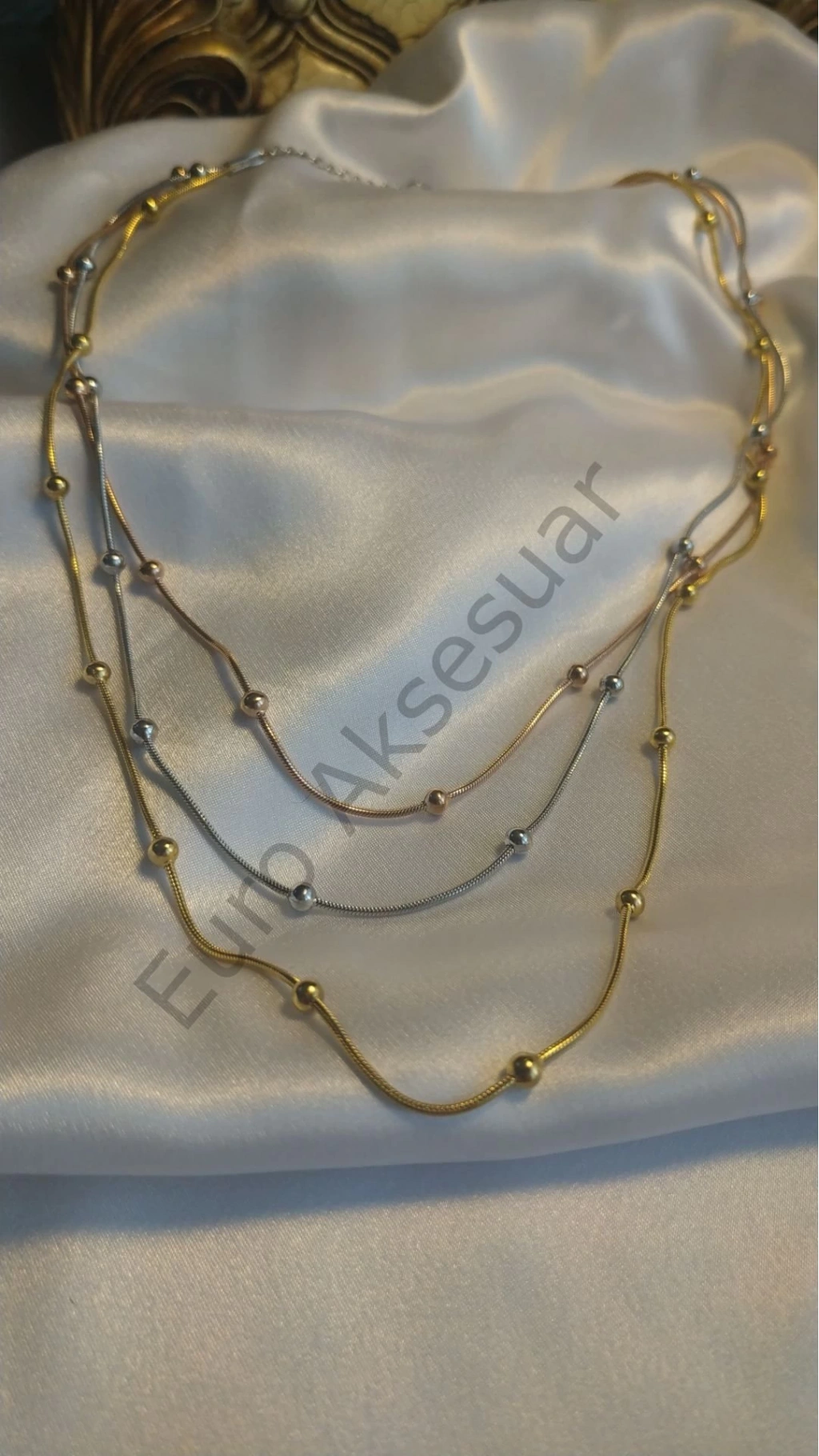 Üç Renkli Dorikalı Üçlü Kolye modelimiz antialerjiktir. Su ile temasında kararma yapmaz. Denizde, duşta, havuzda kullanımda %90'a kadar kararmaya karşı koruma sağlar.Uzun süre kullanım için kolonya, parfüm, dezenfektan vb. ürünlerden korunması önerilir.