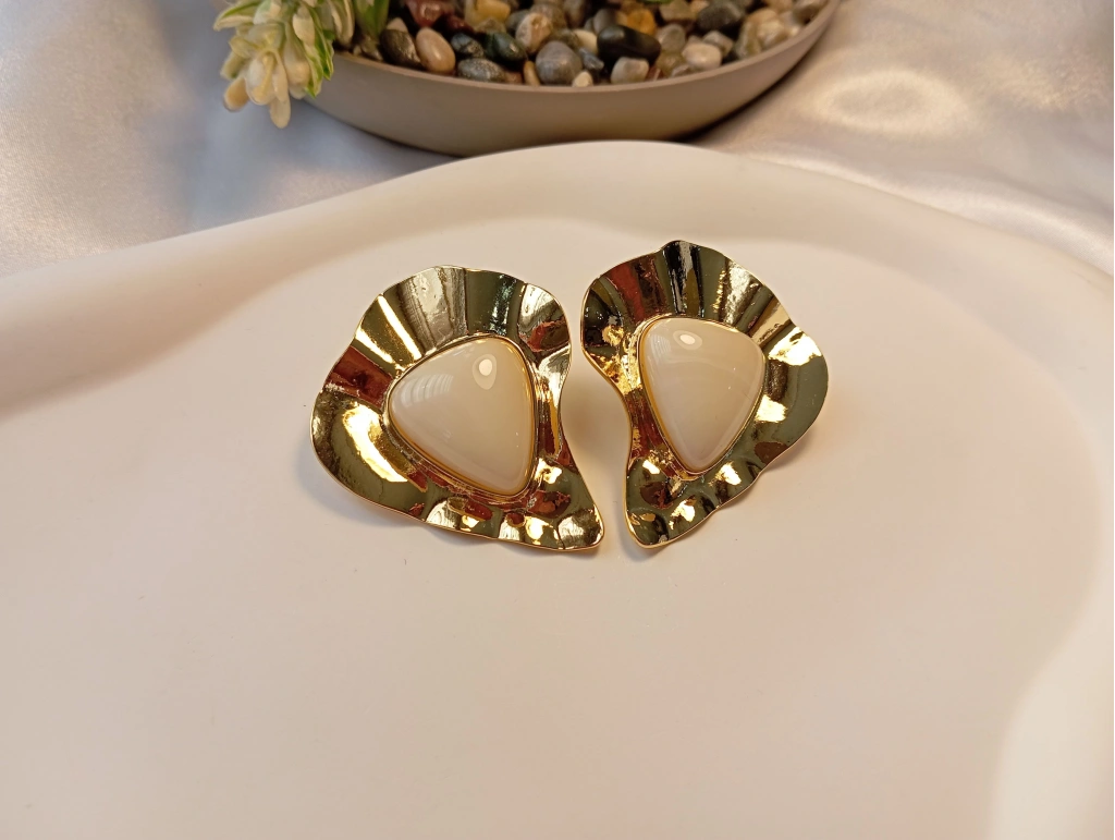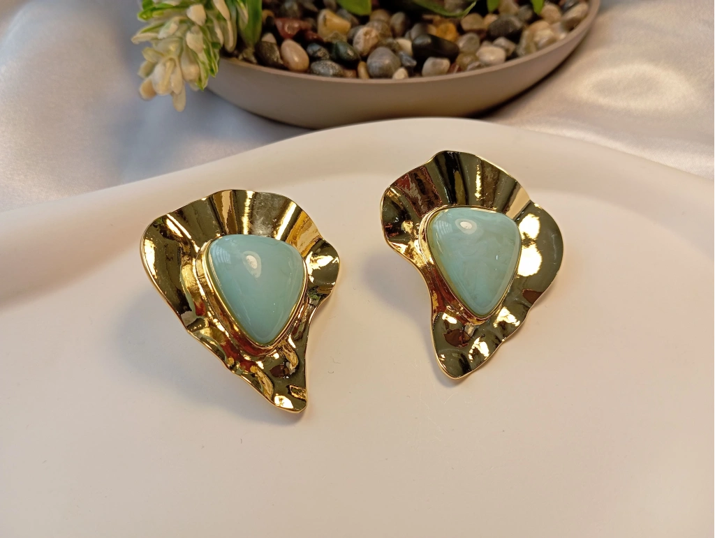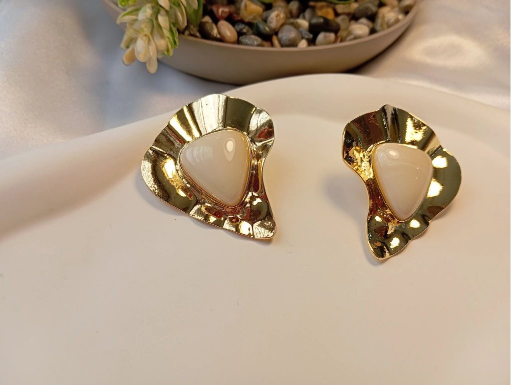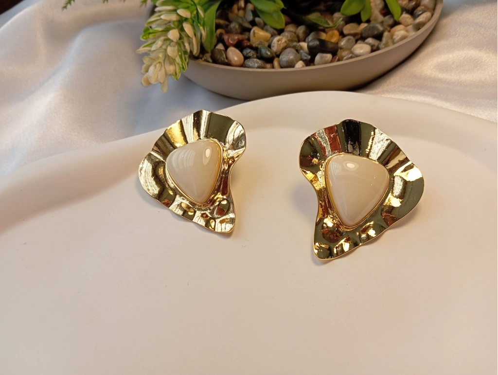 Retro dokunuşları modern çizgilerle buluşturan bu özel tasarım bijuteri küpeler, stilinize cesur ve zarif bir hava katar. Düzensiz dalgalı (dövme metal) tasarımı, ışığı her açıdan yansıtarak yüzünüze ışıltı verirken, merkezindeki üçgen formlu soft taşlar sofistike bir görünüm sunar.