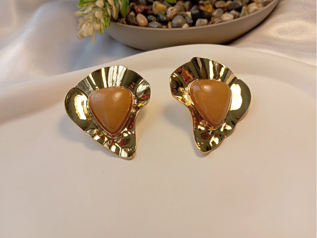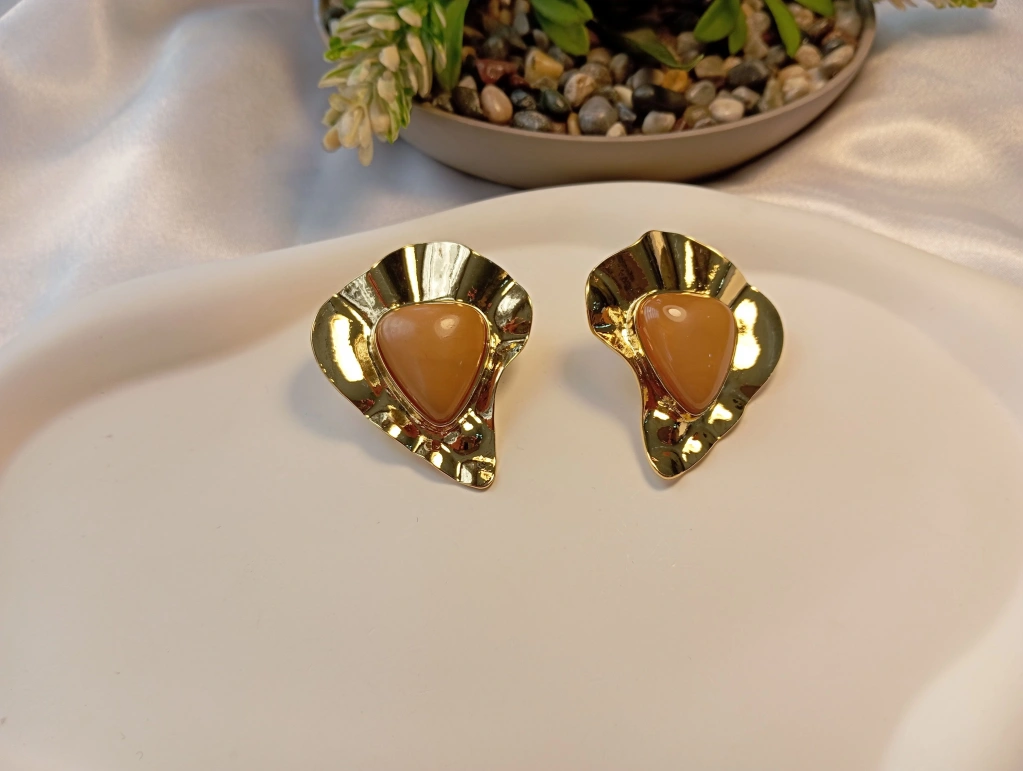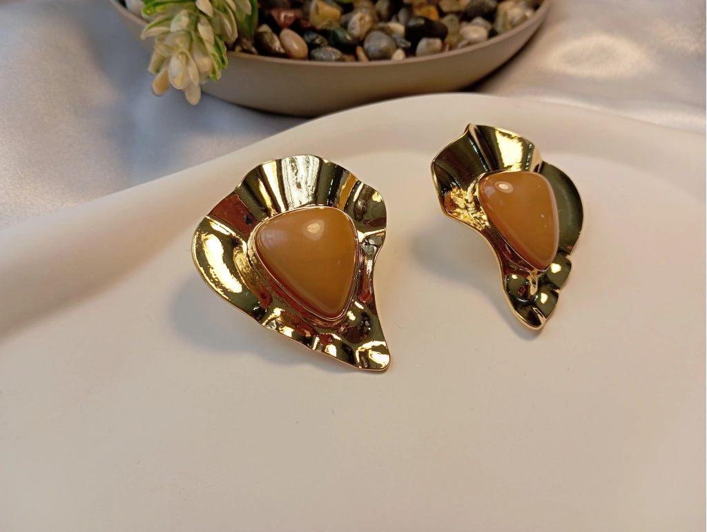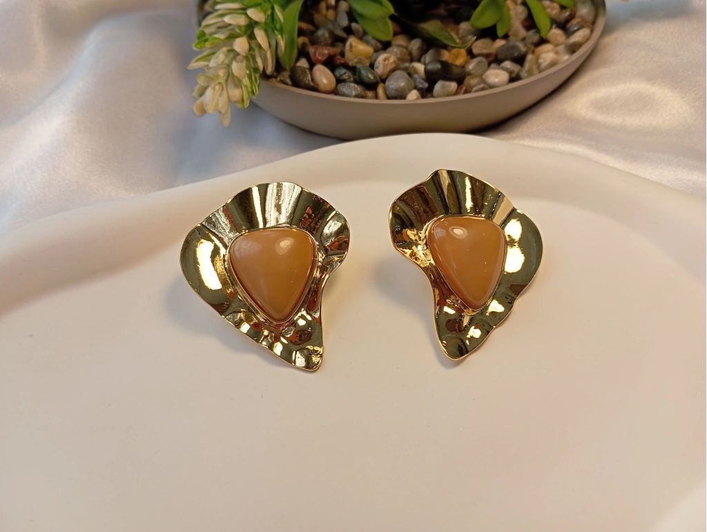 Retro dokunuşları modern çizgilerle buluşturan bu özel tasarım bijuteri küpeler, stilinize cesur ve zarif bir hava katar. Düzensiz dalgalı (dövme metal) tasarımı, ışığı her açıdan yansıtarak yüzünüze ışıltı verirken, merkezindeki üçgen formlu soft taşlar sofistike bir görünüm sunar.