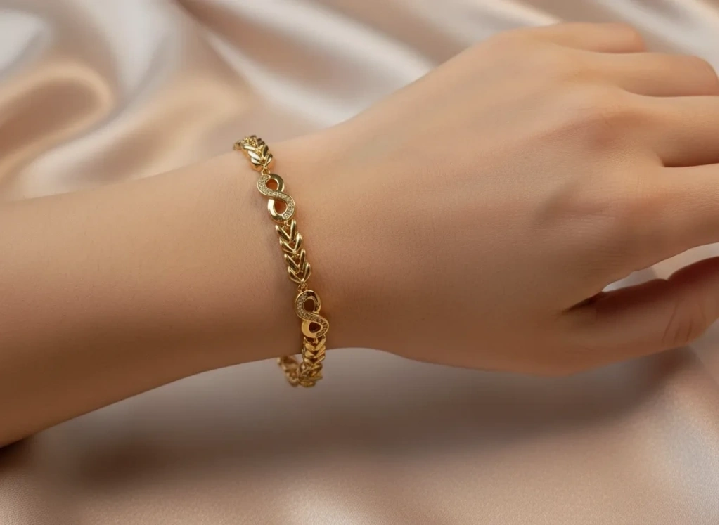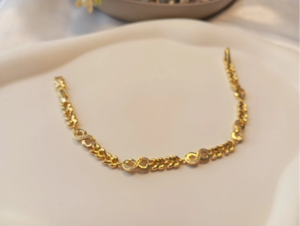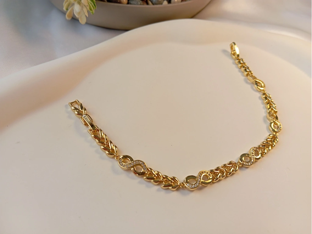 Tasarım: Işıltılı zirkon taşlarla bezenmiş sonsuzluk (infinity) motifleri ve özel örgü zincir yapısı.