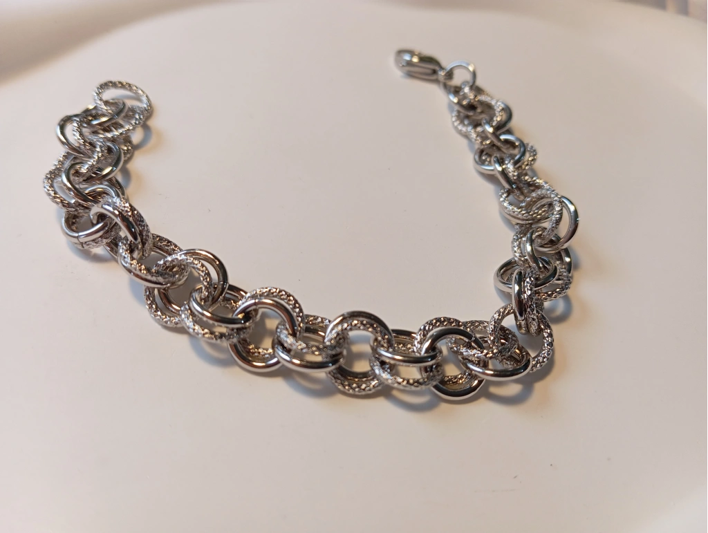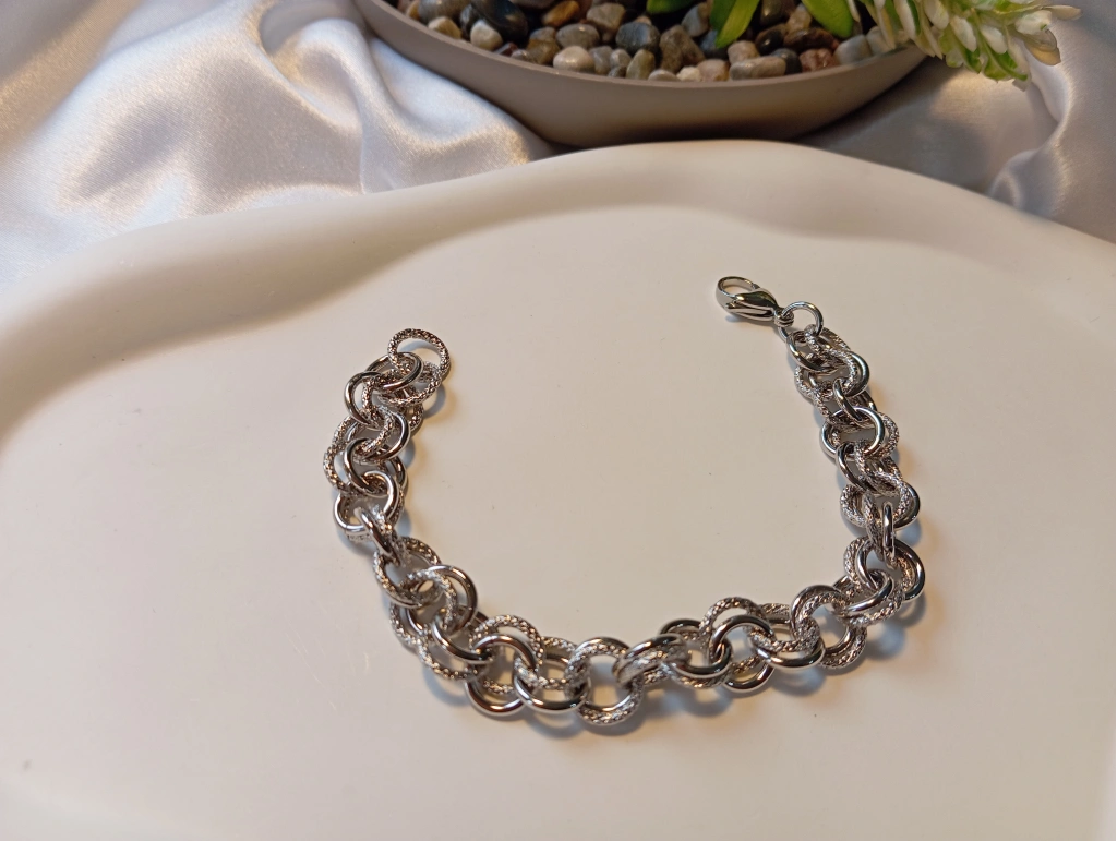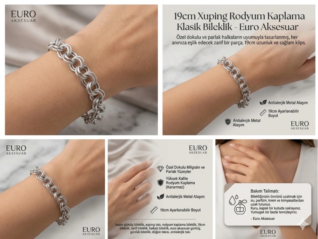 Euro Aksesuar'ın özel koleksiyonundan seçilen bu şık Xuping bileklik, zarafeti ve modern tasarımı bir araya getiriyor. 19 cm uzunluğundaki bu parça, birbiriyle uyumlu, hem pürüzsüz hem de ince işlenmiş dokulu halkaların kombinasyonuyla dikkat çekiyor. Yüksek kaliteli materyallerden üretilen ve gümüş kaplama ile korunan bileklik, hem günlük kullanımda hem de özel günlerde tarzınızı tamamlamak için idealdir. Sağlam klipsi ile güvenli ve konforlu bir kullanım sunar. Kendinizi şımartmak veya sevdiklerinize unutulmaz bir hediye vermek için mükemmel bir tercih.