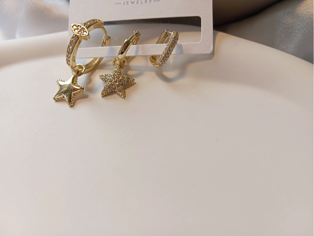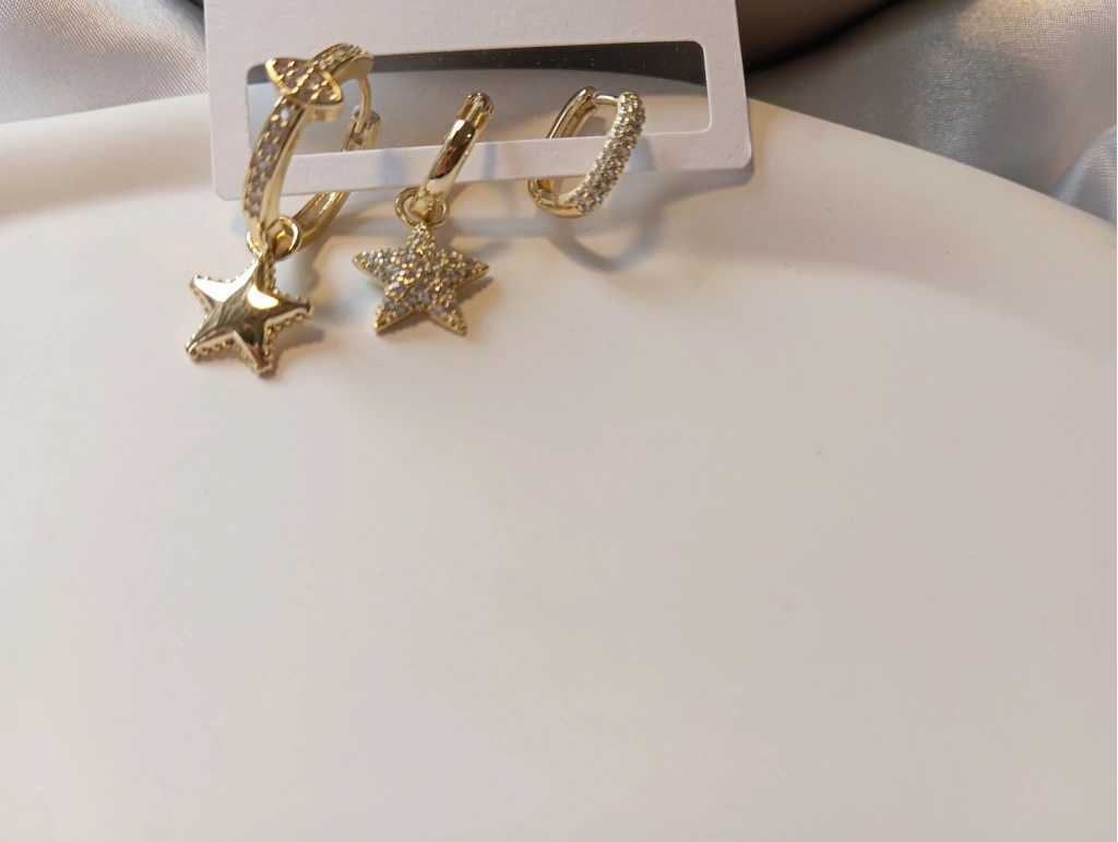 Xuping üçlü küpe seti, birbiriyle uyumlu üç farklı tasarımdan oluşur. Set içerisinde; sallantılı yıldız figürlü halka, tam tur zirkon taşlı halka ve zarif minimal yıldız detaylı modeller yer almaktadır. 1 cm ideal boyutuyla çoklu kulak deliklerine sahip olanlar için kusursuz bir kombin sunar. Yüksek kaliteli pirinç üzerine yapılan lüks gold kaplaması sayesinde antialerjiktir ve cildinize dosttur.