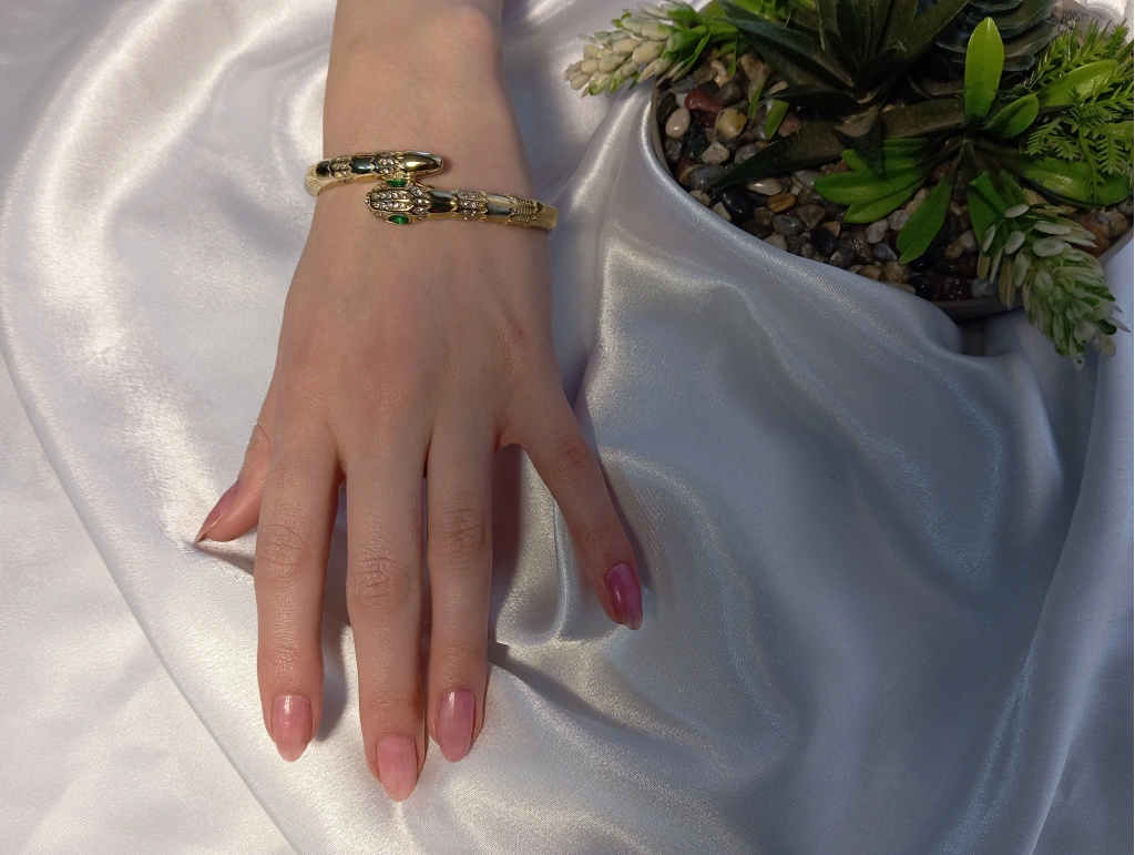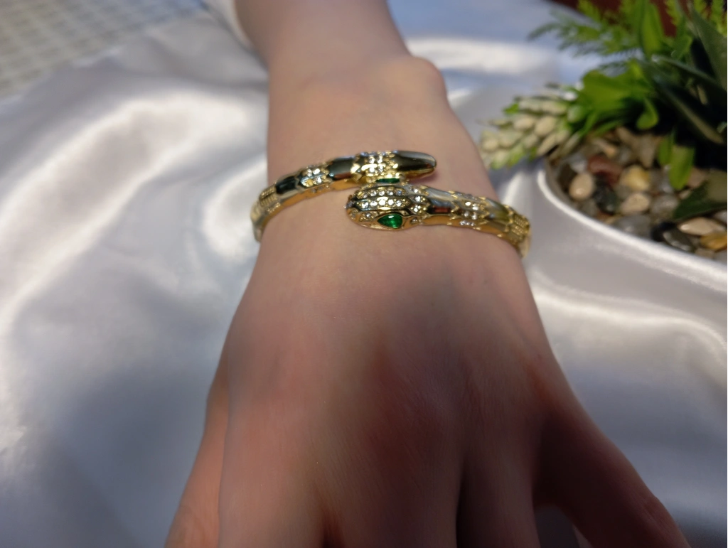 Tasarımın odak noktası olan zümrüt yeşili gözler, bakışları üzerine çekerken; gövdeyi saran pırlanta ışıltısındaki zirkon taşlar lüks bir mücevher görünümü sunar. 316L Paslanmaz Çelik (Stainless Steel) materyalden üretildiği için bu bileklik, sınıfının en dayanıklısıdır.
