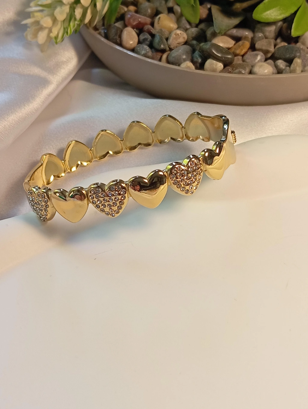 Işıltılı Kalp Detayı: Bilekliğin odak noktası olan zarif kalp figürü, özenle yerleştirilmiş parlak zirkon taşlar ile süslenmiştir. Her hareketinizde ışığı yakalayan bu taşlar, bileğinize büyüleyici bir ışıltı katıyor.